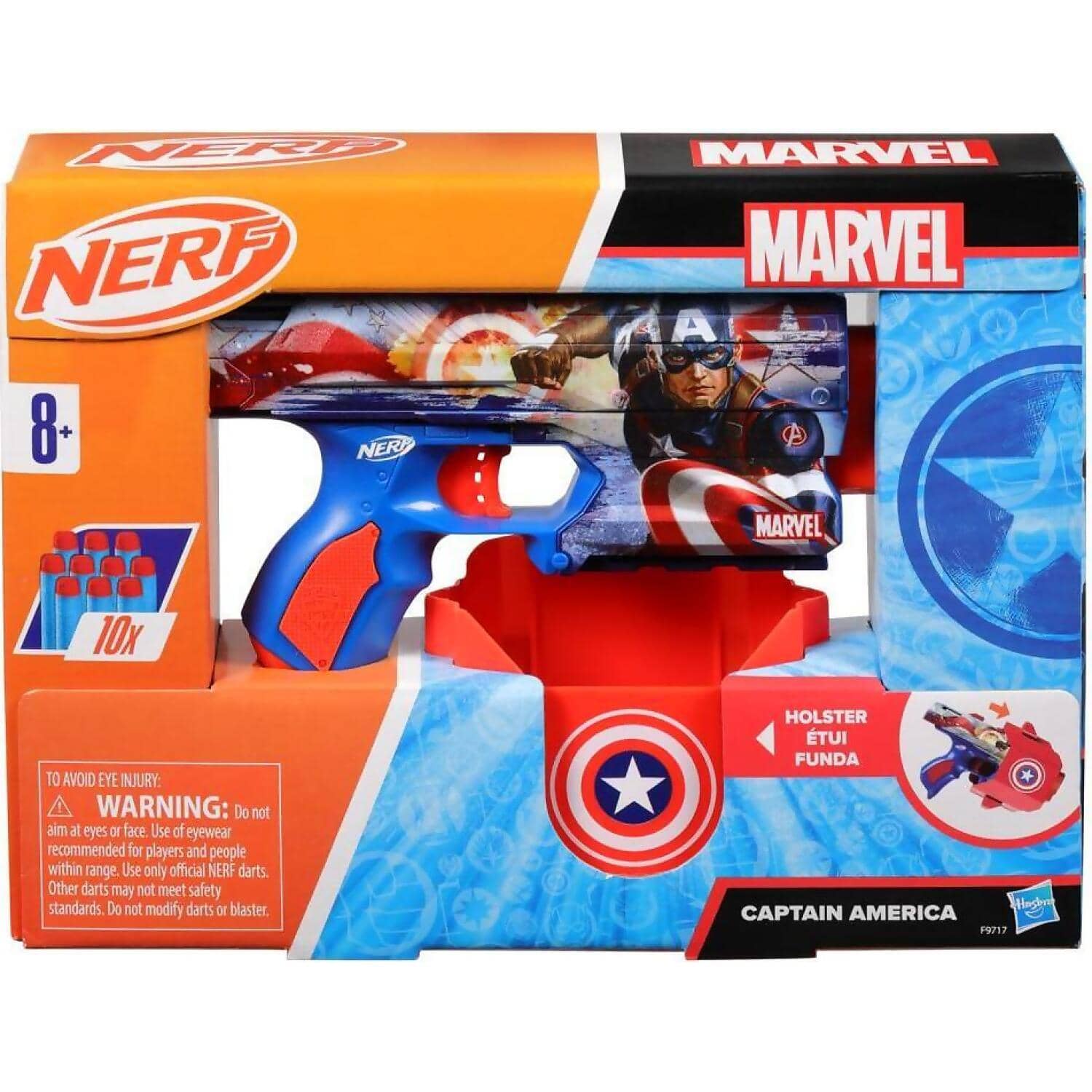 •NERF MARVEL CAPTAIN AMERICA BLASTER: Head into heroic adventures with this eye-catching blaster that features Captain America designs on both sides