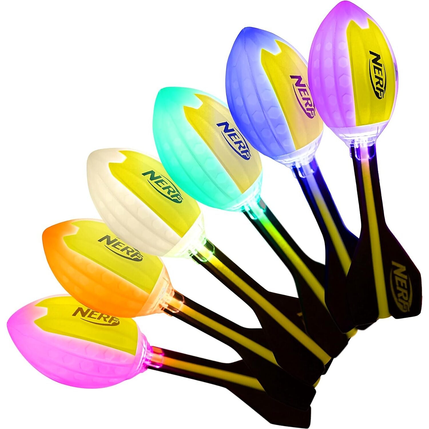 Go deep and go dark with some killer passes with the Nerf Lightstrike Vortex Football! This impact activated LED football illuminates from the inside with a tap and automatically shuts off when not in use. The color changing technology lets you light up the night with red, green and more! Not only see the difference but hear it with the built in whistles!