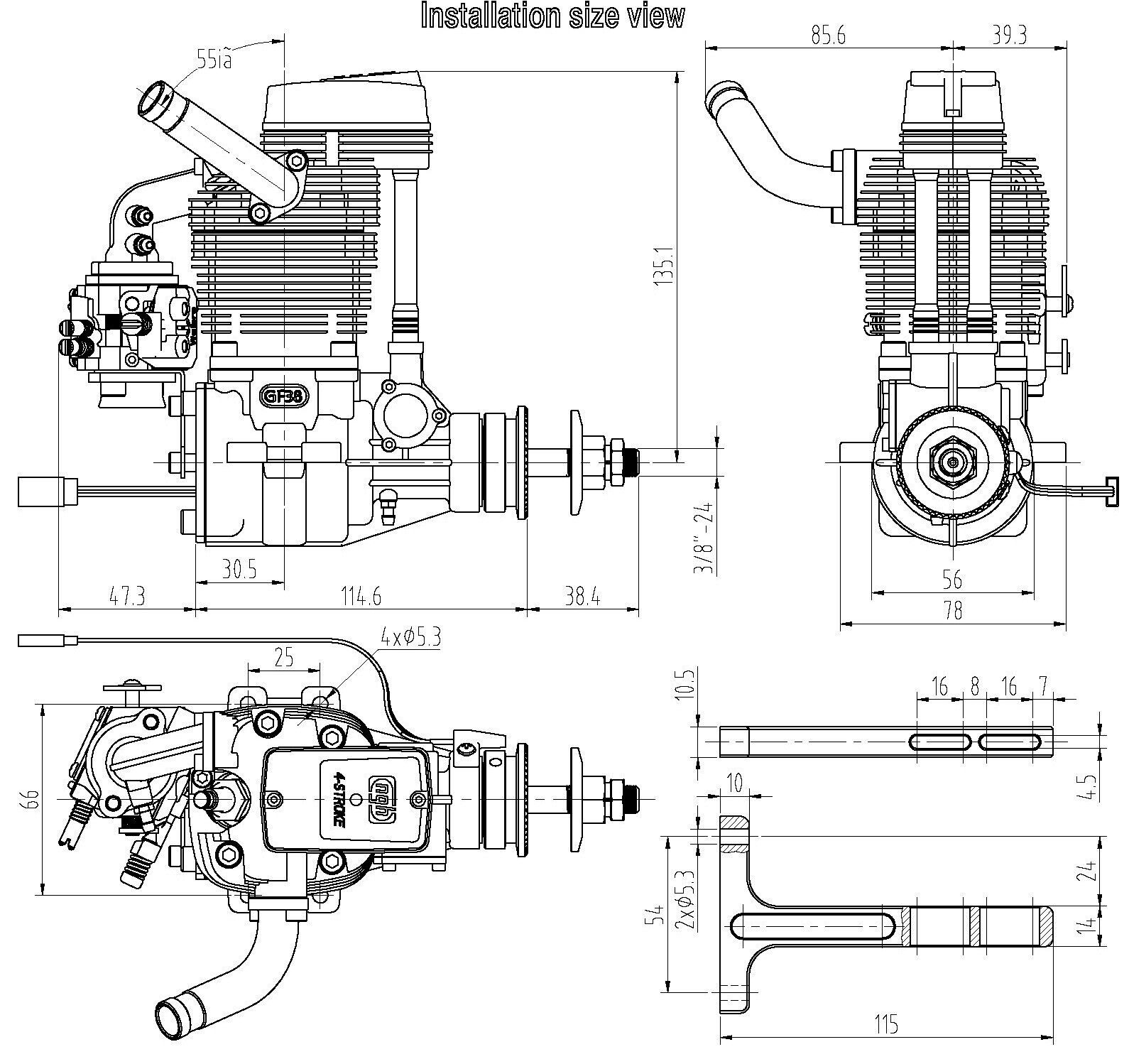 GF38 has the installation size of 160-240 glow size 4 stroke engine, and it has power comparable to a 120-180. It is suitable for RC aircraft with take-off weights of 8-12kg .