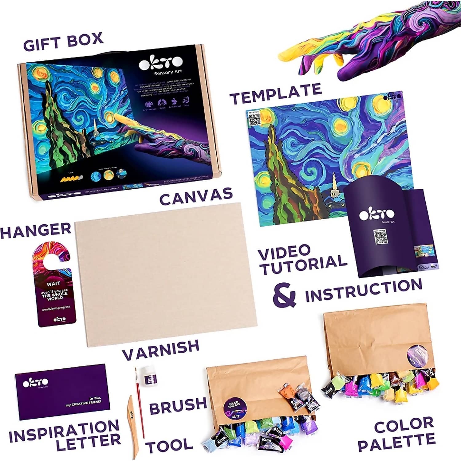 Immerse yourself in a calming, tactile experience with the OKTO Sensory Art - Creative Set Starry Night. Designed for self-expression and mindfulness, this set invites users to trace celestial swirls and create a textured masterpiece inspired by Van Gogh’s iconic night sky. The soft, mess-free clay glides effortlessly onto the canvas, allowing colours to blend and shapes to form with ease.