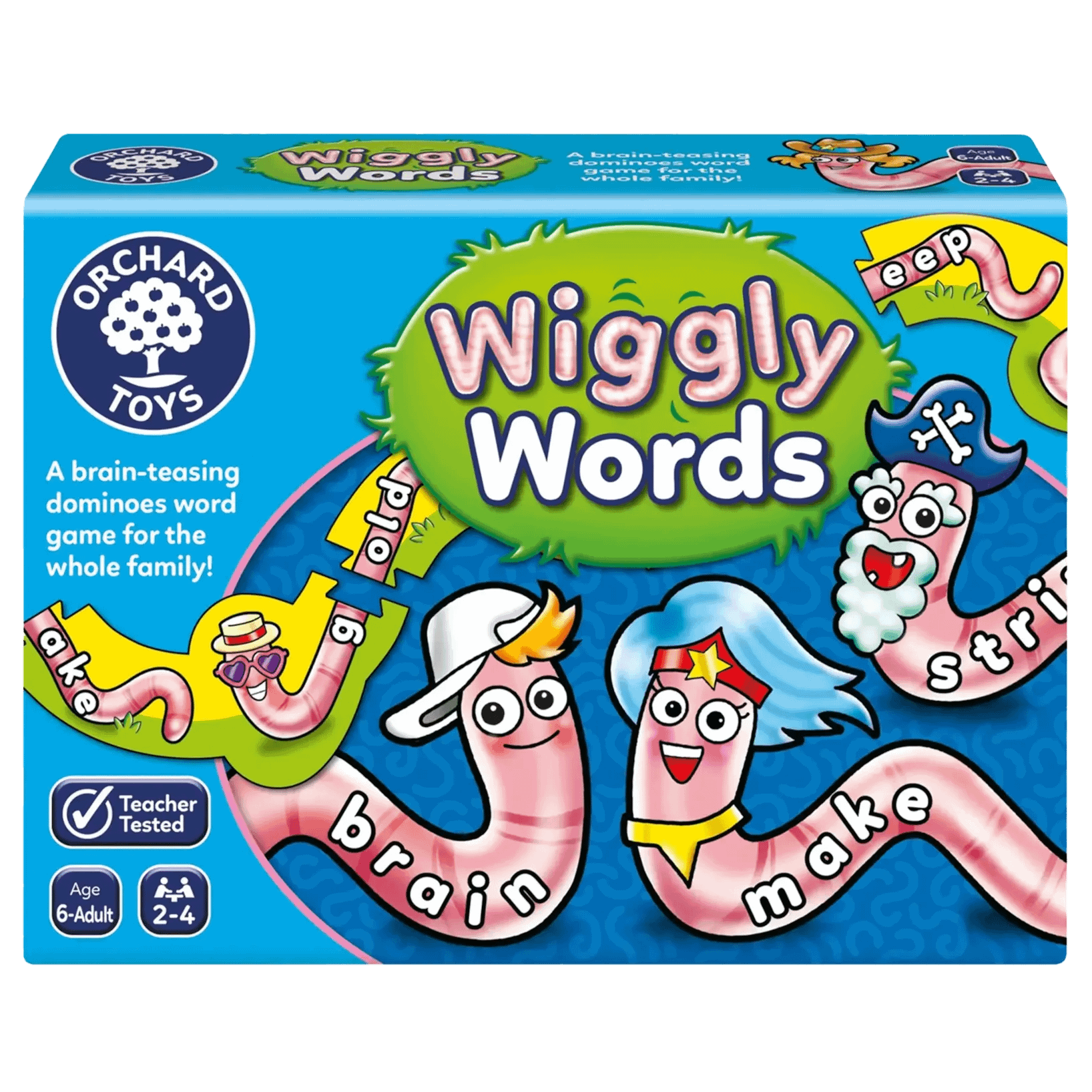 The Orchard Toys - Wiggly Words Game is a brain-teasing, domino-style word game that makes spelling practice fun for the whole family. Players take turns to add to the wiggly domino line by building new words, enhancing their literacy skills in an engaging way.