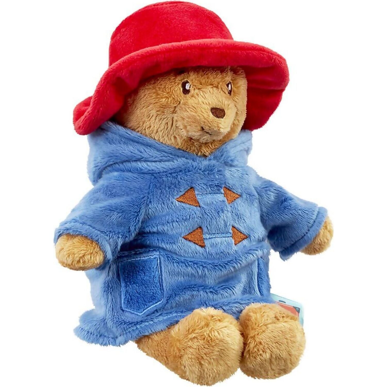 Paddington timeless bear wears his famous red hat and blue duffle coat with a hood.