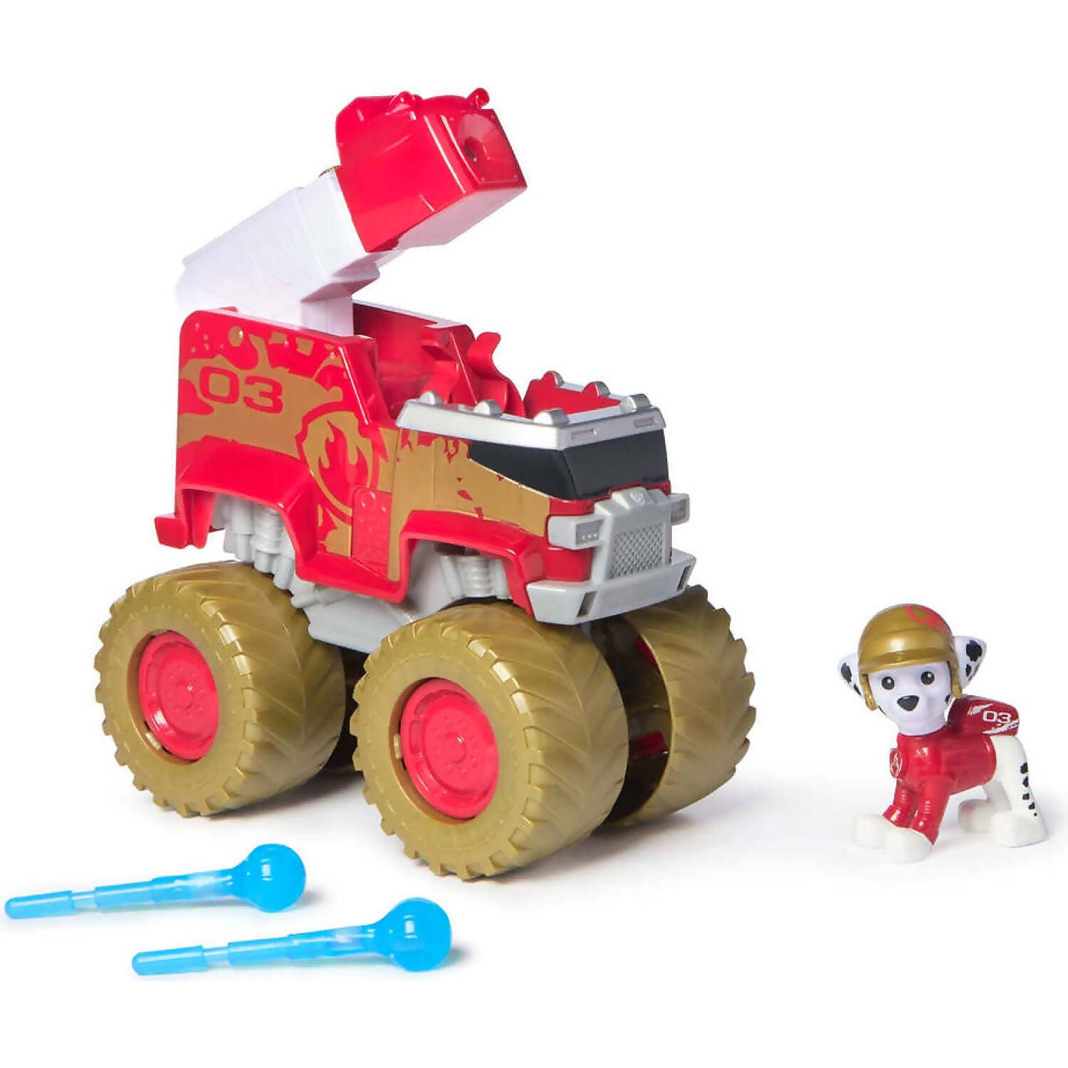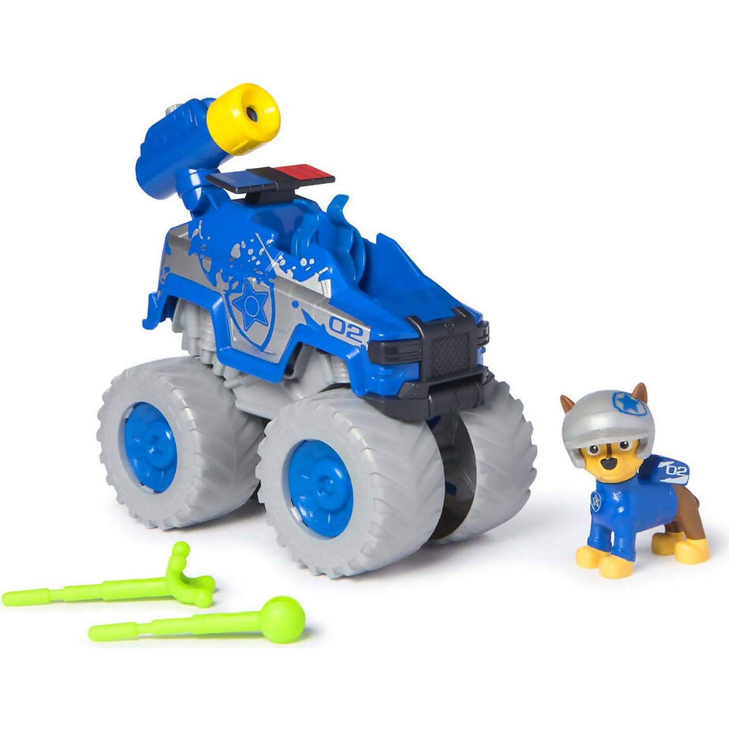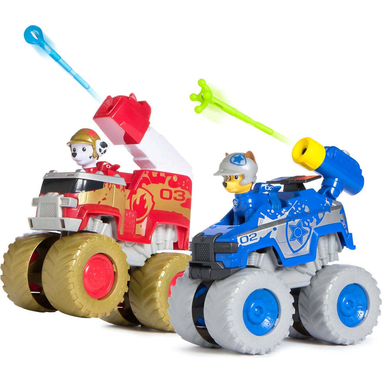 Each monster truck features oversized wheels, with authentic PAW Patrol design and styling, so they look just like the vehicles from the show! Clip Chase & Marshall in their driver’s seats before racing to the rescue. When it’s time for action, load the projectile launchers with one of two projectiles, then push the button on the launcher to fire and save the day!