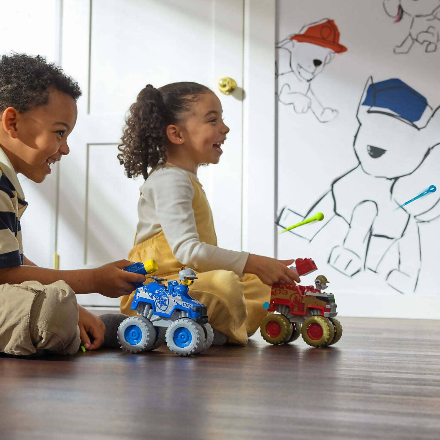 Explore thrilling rescue missions with Chase and Marshall, in their metallic team uniforms, and their Rescue Wheels vehicles!