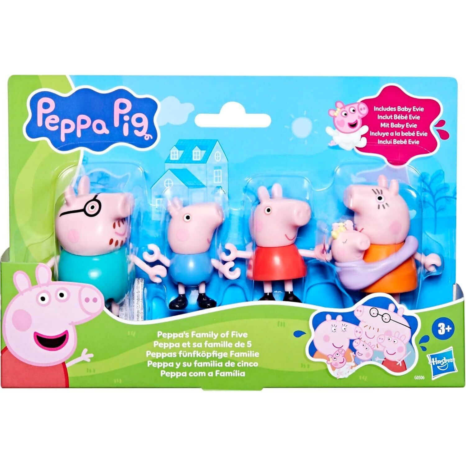 - Includes 5 figures: Daddy Pig, Mummy Pig, George, Peppa, and Baby Evie in her carrier