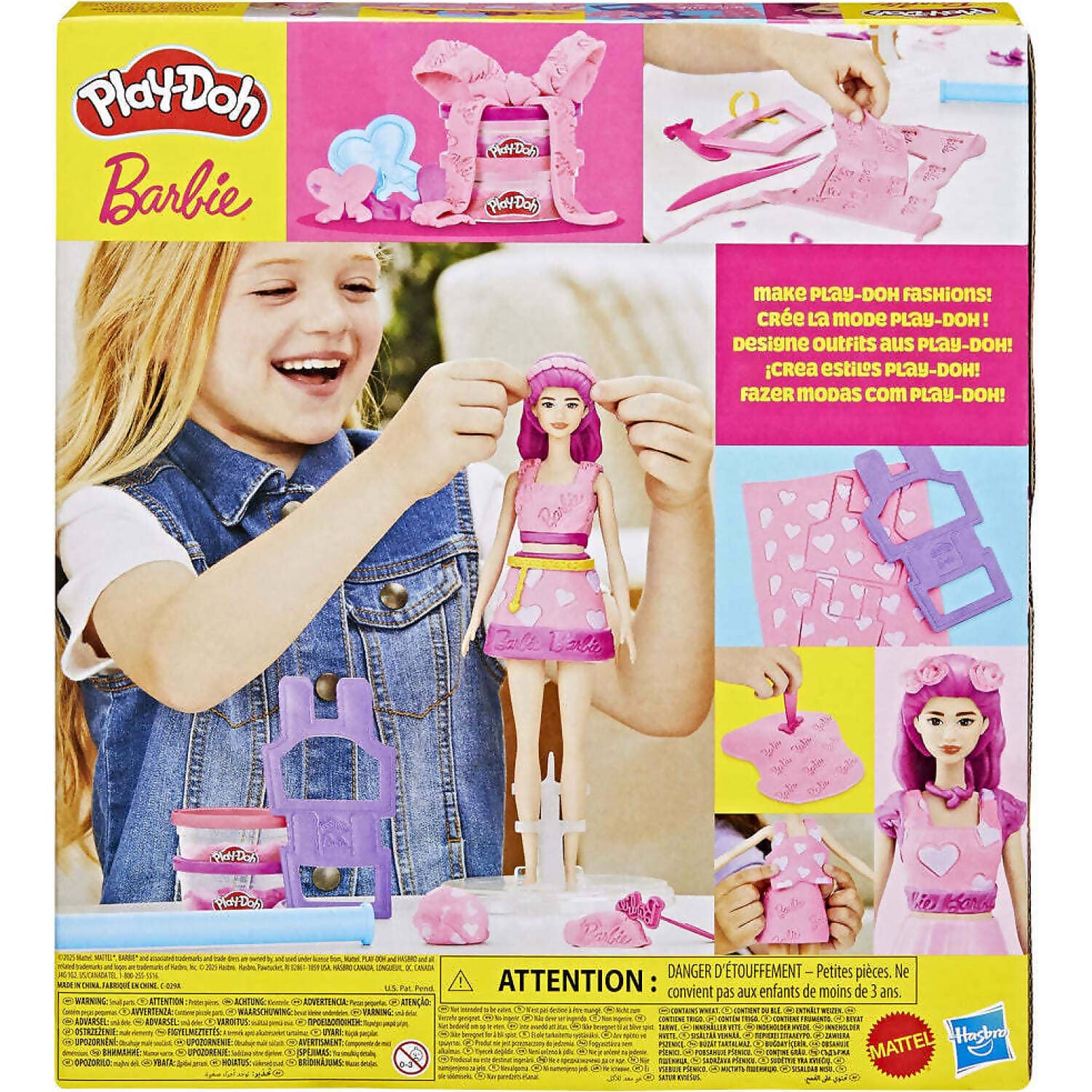 The set includes a pre-made Play-Doh pattern sheet that mimics fabric, plus two hair moulds to create short bobs or long flowing locks. Children can use the included tools to craft skirts, dresses, and accessories adorned with hearts, bows, and the Barbie logo. With two vibrant Play-Doh cans in pink and purple, the possibilities for fashion fun are endless.