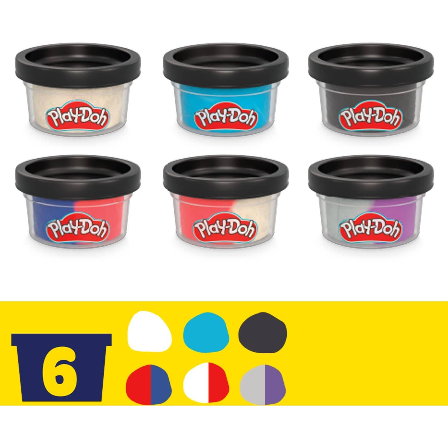 - 6 MINI PLAY-DOH CANS: This Play-Doh set comes with 1-ounce cans of white, light blue, and black as well as dual-color cans of red and blue, white and red, and light gray and purple. Contains wheat