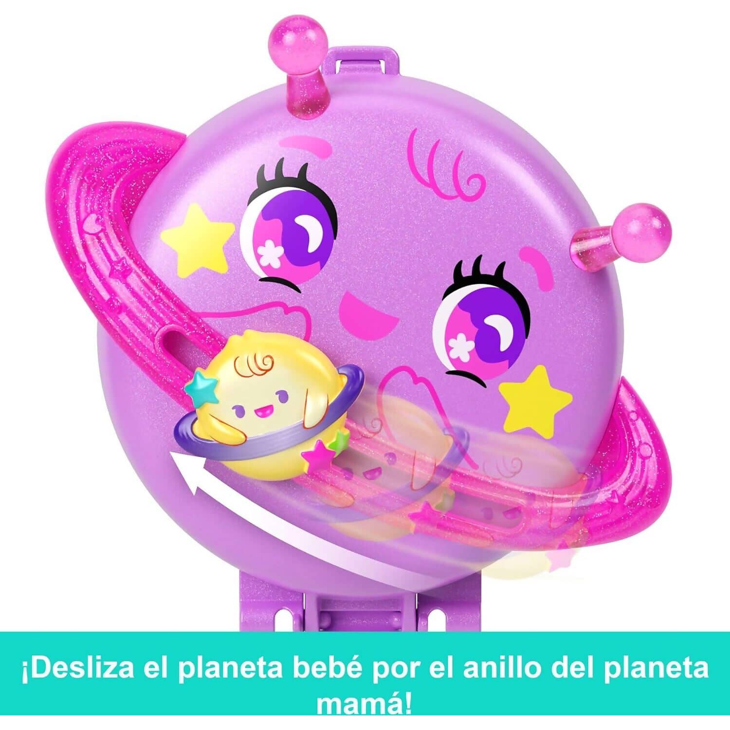 Blast off into a galaxy of fun with the Polly Pocket Planet Polly Compact Playset. Shaped like a cheerful planet with a smaller satellite that slides along its ring, this compact opens to reveal a dazzling space-themed adventure. Children can explore the cosmos with one micro Polly doll and her adorable pet puppy companion.