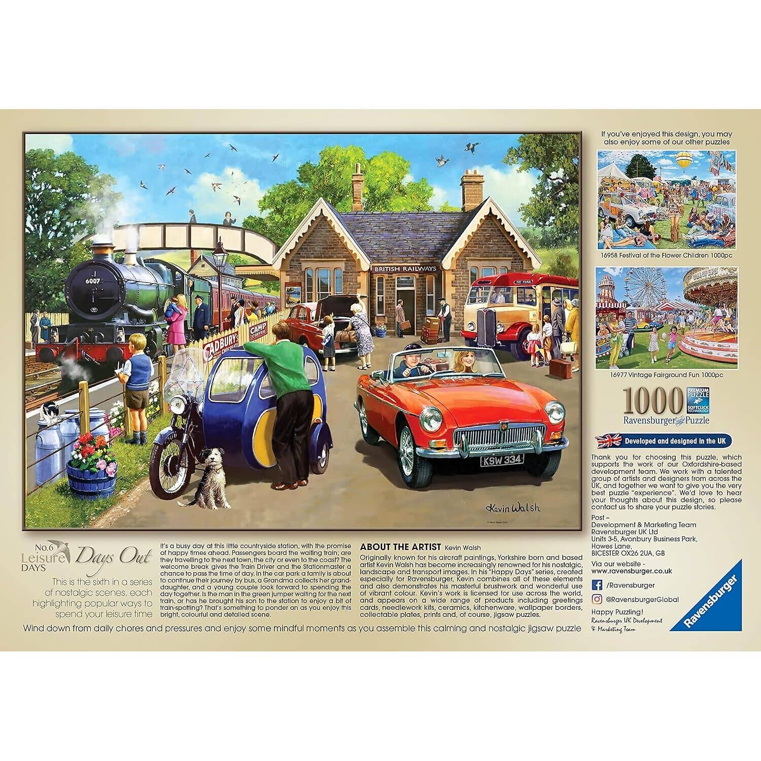 The Ravensburger - Leisure Days No6 Days Out Jigsaw Puzzle 1000pc is a captivating and educational puzzle that offers a unique and fun experience. This puzzle immerses you in a scene of happy times ahead. Passengers board the waiting train; are they travelling to the next town, the city or even to the coast? In the car park, a family is about to continue their journey by bus, a Grandma collects her grand-daughter, and a young couple look forward to spending the day together.