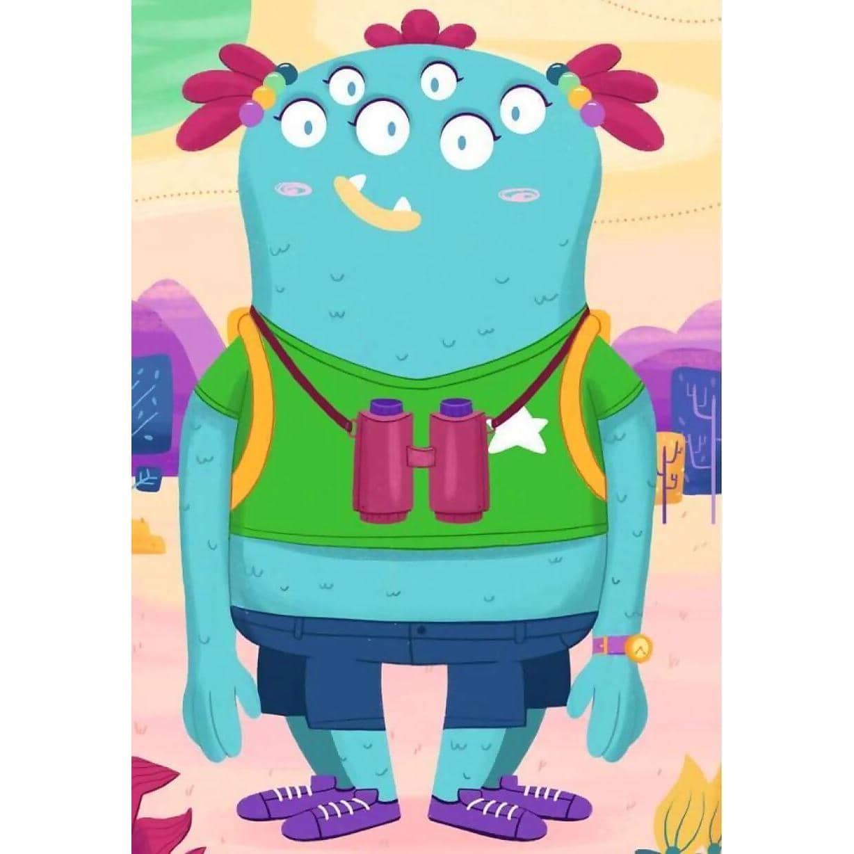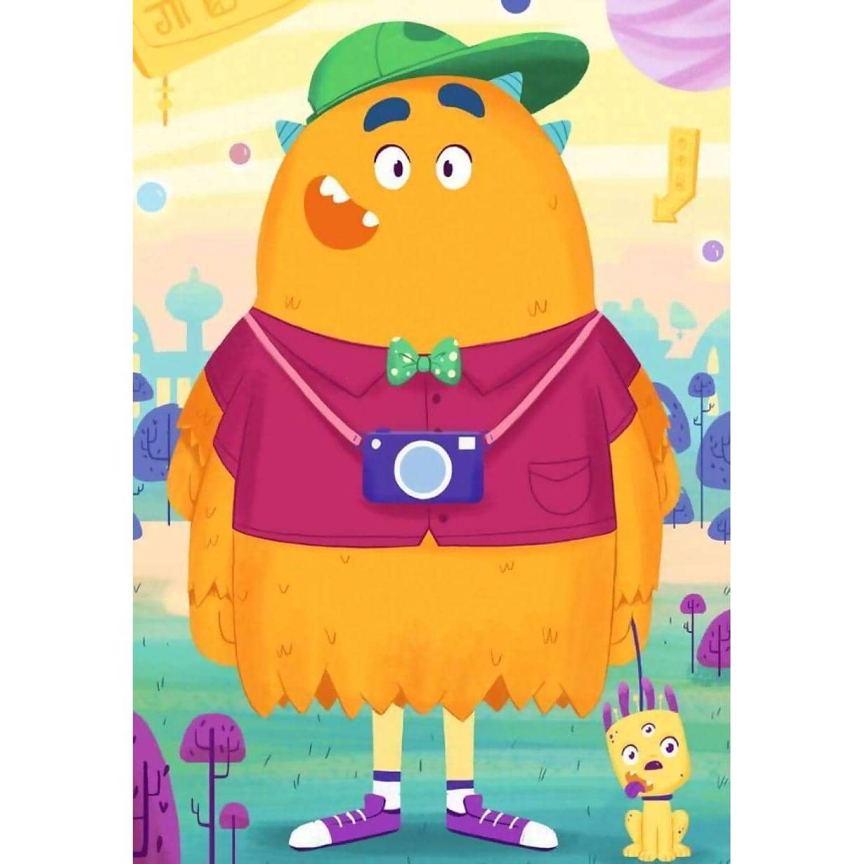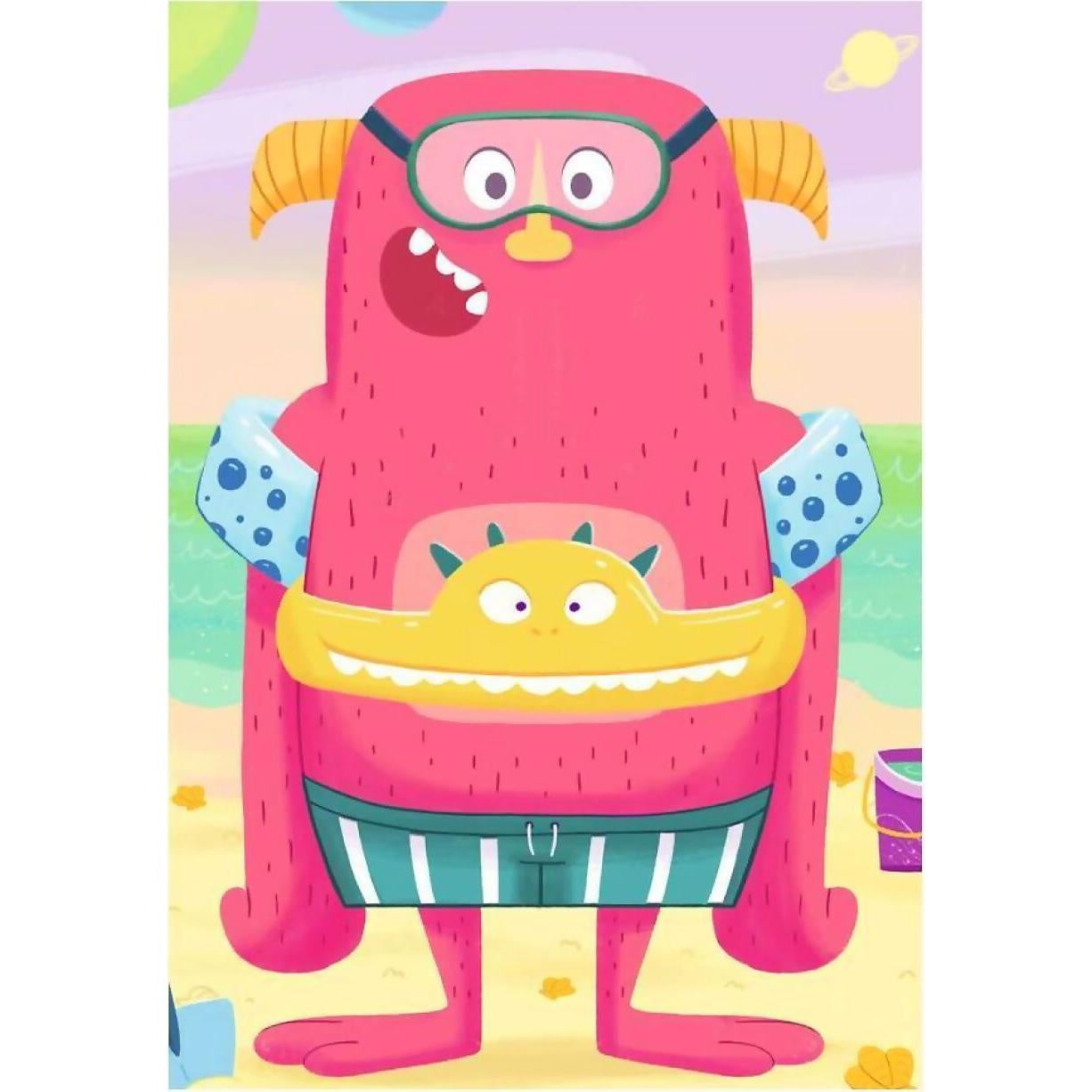 This set of 3 24 piece puzzles depicts funny monsters a pink monster who loves the water, an orange monster who loves to take photos and a blue monster who loves to look at the world through binoculars.