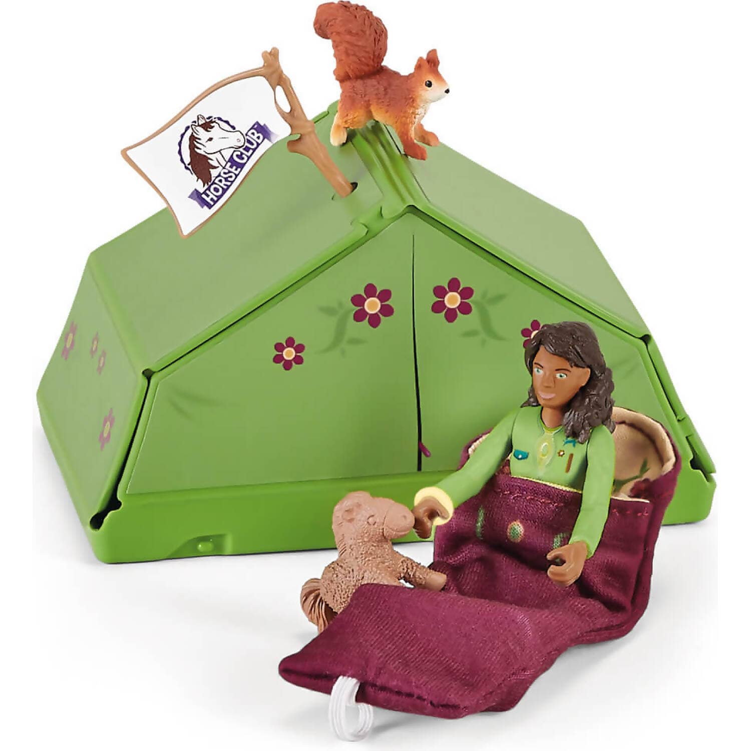 The Camping Adventure playset makes a great gift to expand your schleich® HORSE CLUB collection. The playset comes with a toy tent and fun accessories like a sleeping bag, a playful squirrel, apples for Sarah’s horse and more. You can even personalize Sarah’s tent with the flower stickers that come with it. Combine this playset with our Camping Accessories kit (sold separately) for even more fun and adventures.