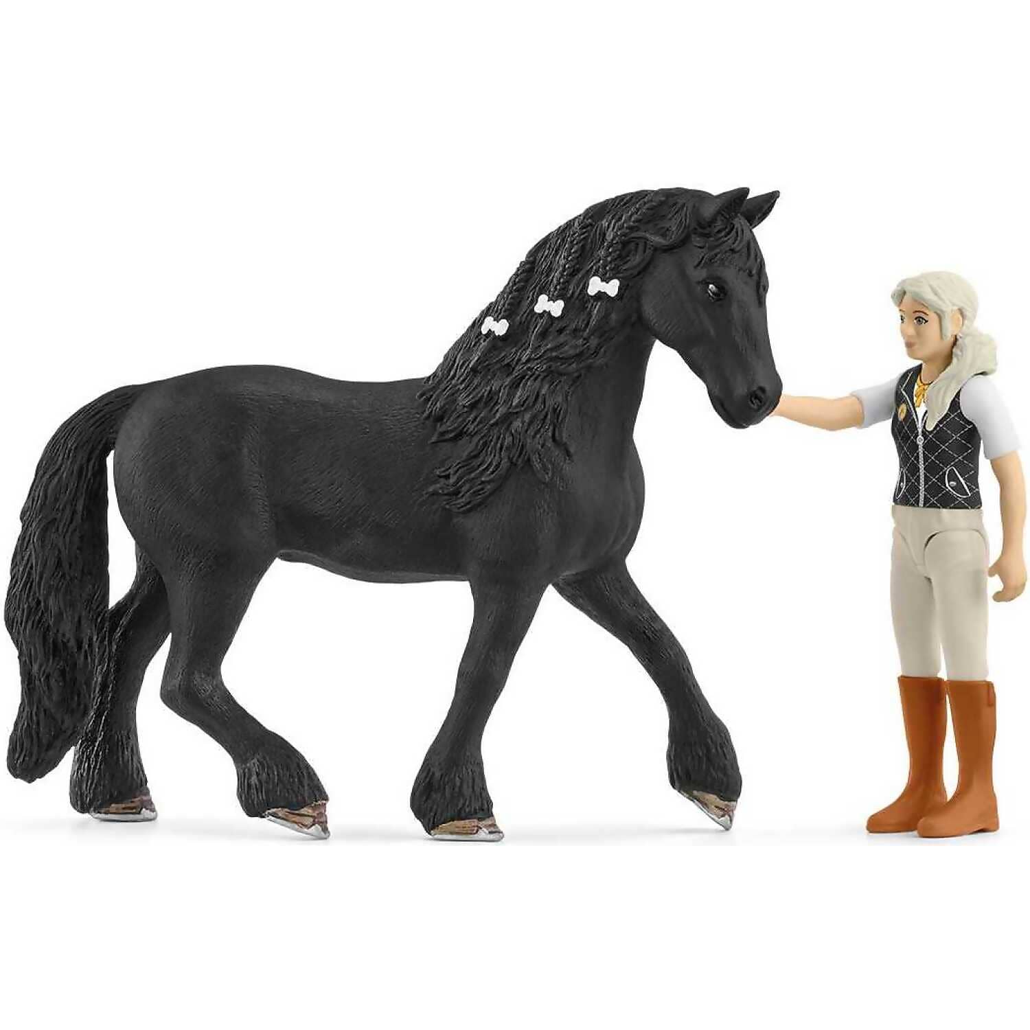 When Tori goes for a ride, she takes her best friend, the Friesian Mare Princess. In the HORSE CLUB's Tori & Princess playset from schleich®, she saddles her faithful four-legged friend and puts the bridle on. Finally, she puts on her own helmet. Has she forgotten anything?