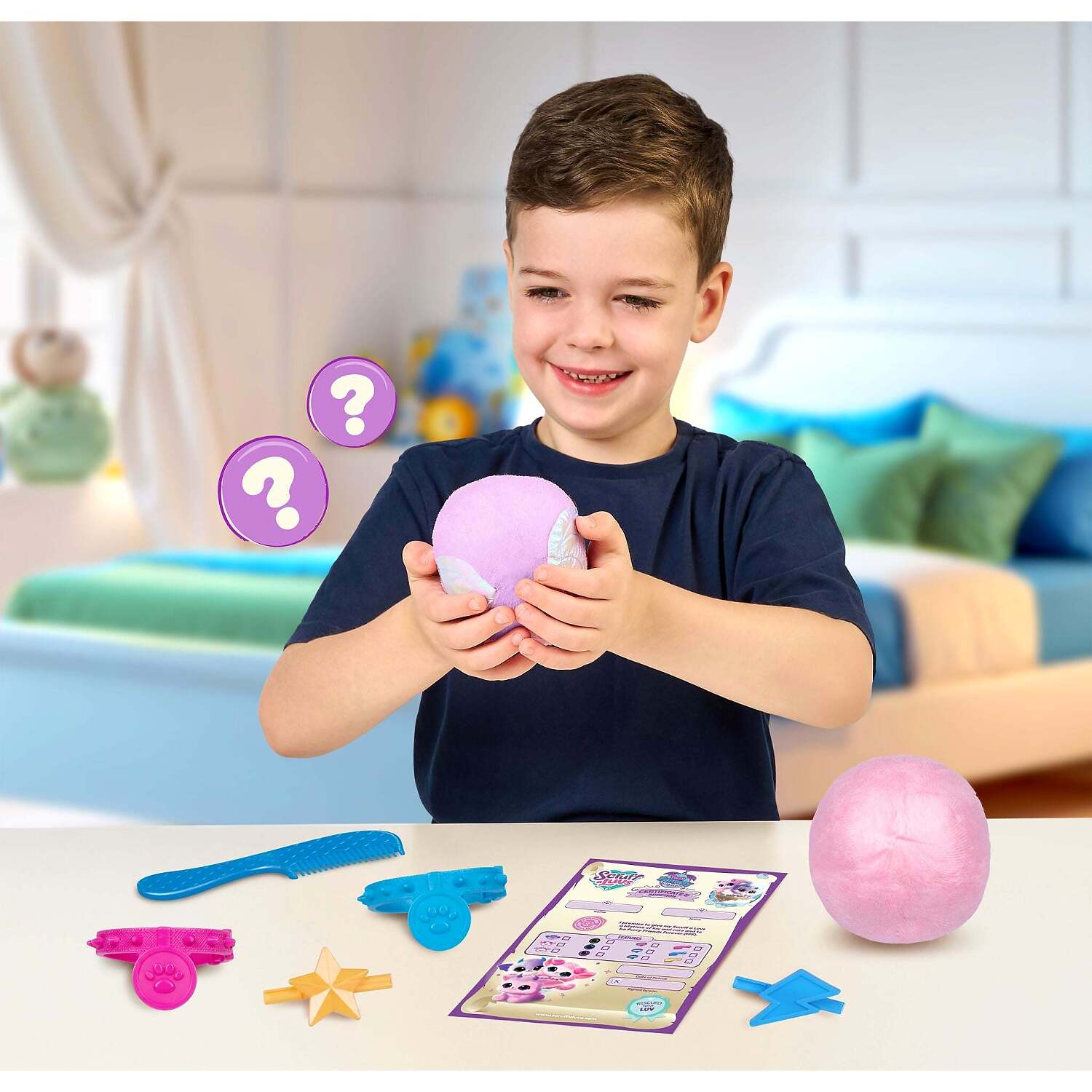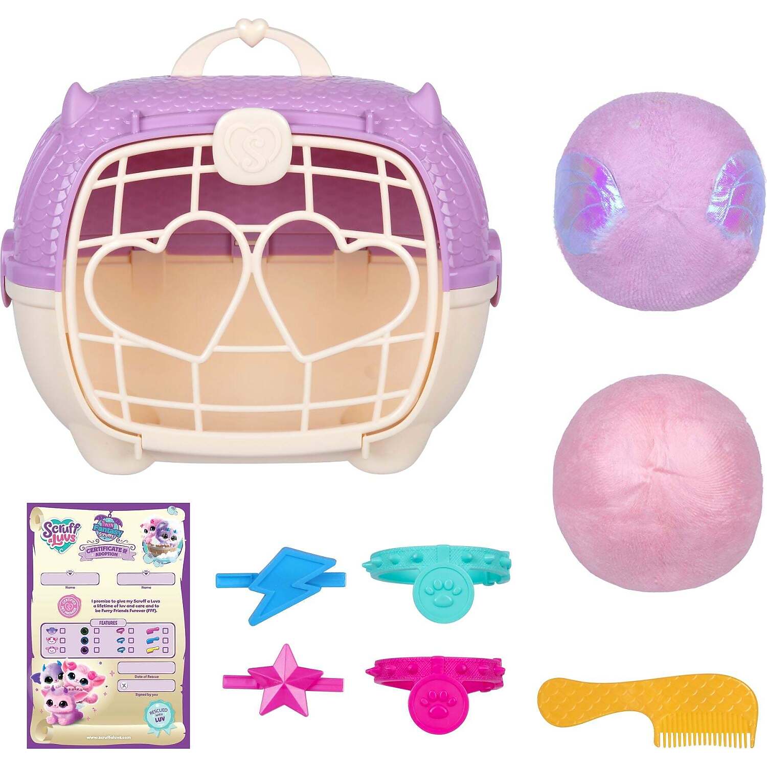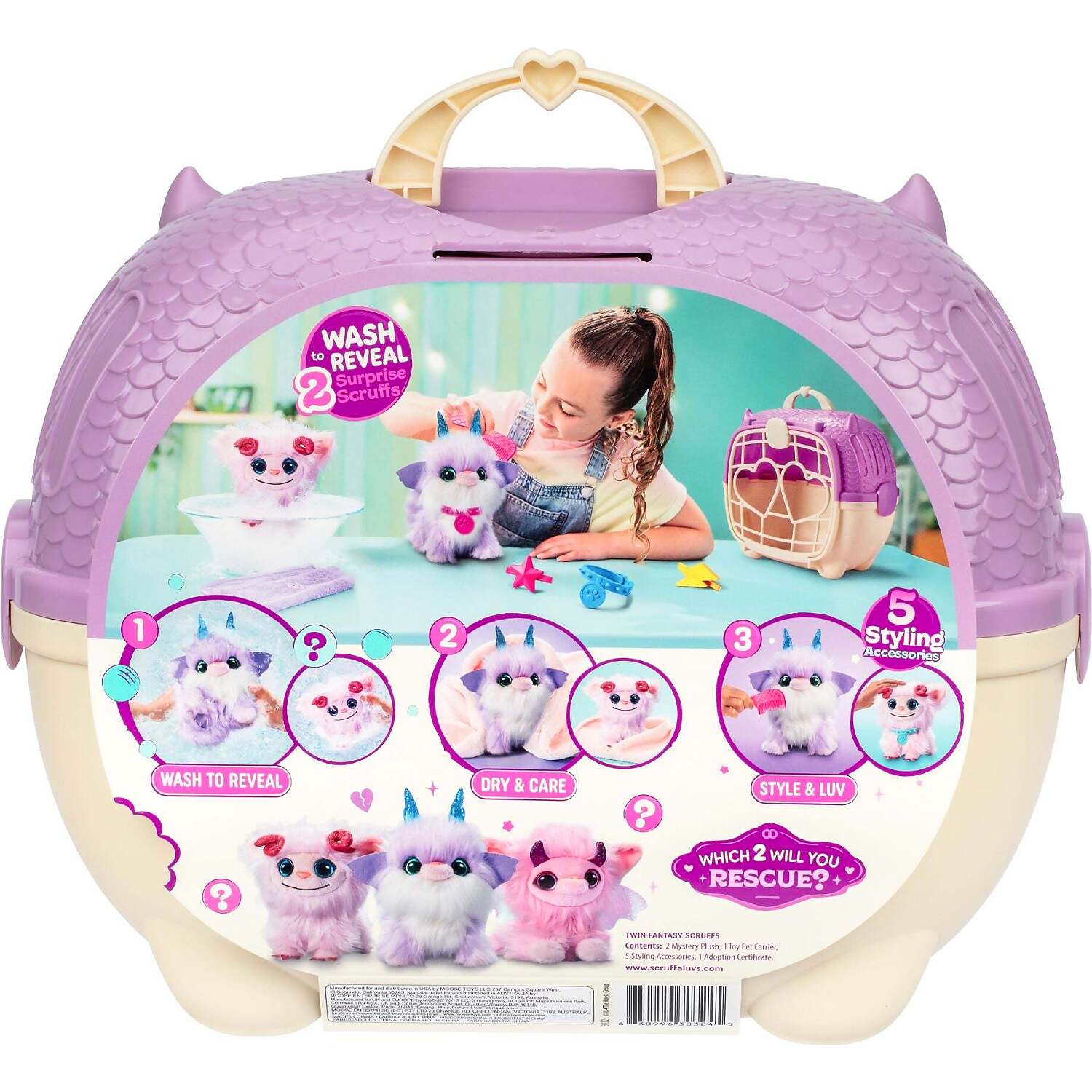 Your child will love to experience the magical wash and reveal process, before revealing the cutest furry friends!Wash, dry, and groom your Fantasy Scruffs to begin the ultimate twin rescue! Use the comb to brush their fur, add a collar, and attach their clips, and then complete the adoption certificate to make them truly yours! Each Fantasy Scruff is super soft and cuddly, perfect for snuggles. Your child will love caring for their Scruffaluvs and carrying them everywhere they go, with the new cozy twin carrier! Rescue and adopt your Fantasy Scruffs and find your new FFF (Furry Friend Furever)!