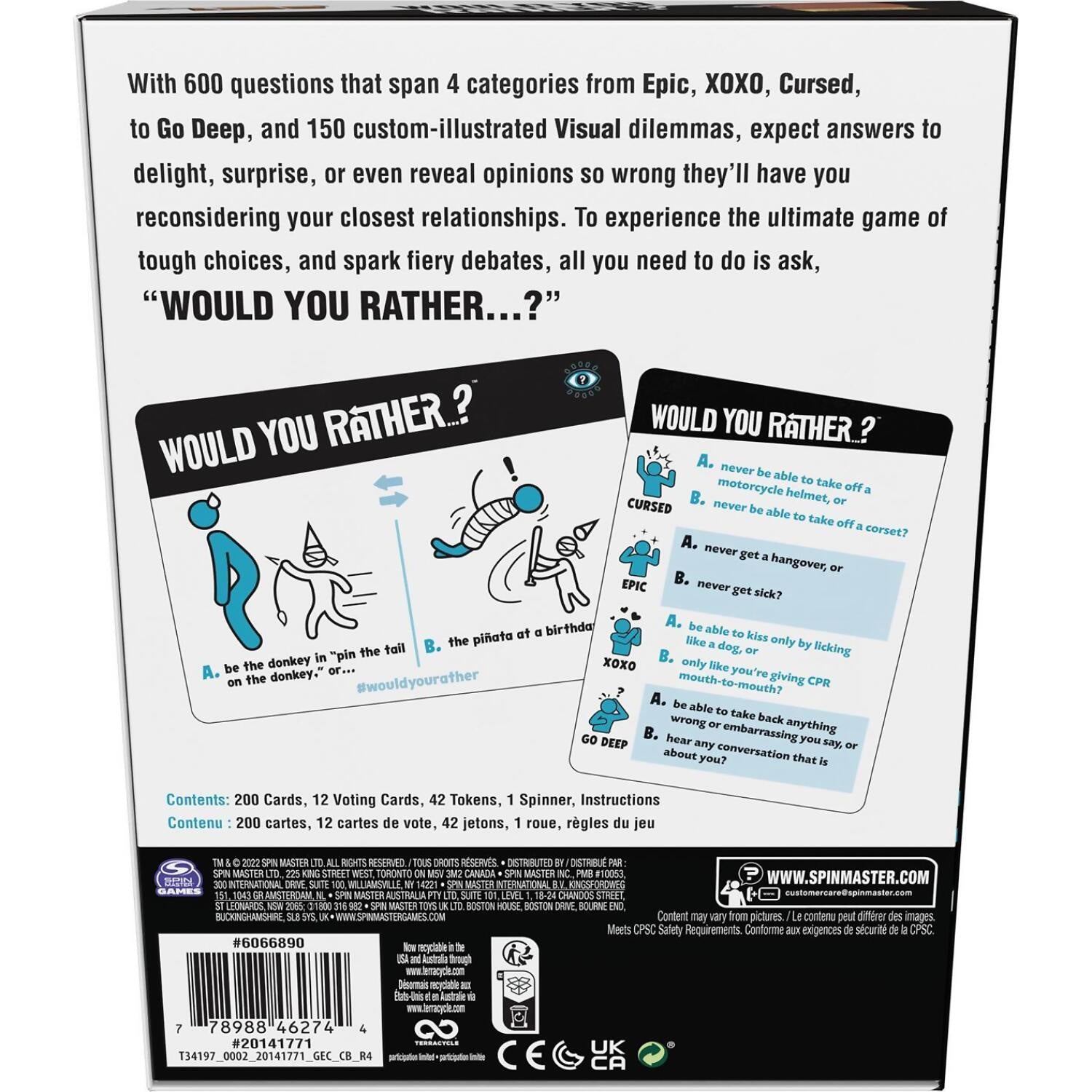 Introducing Would You Rather? The Game. From Spin Master Games, this adult card game is for 3-6 players, ages 14 and up. Players are forced to make tough decisions between two equally terrible OR equally fabulous options.