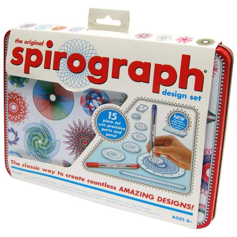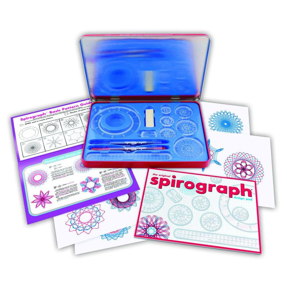 Includes: 7x Spirograph Precision Wheels, Spirograph Precision Ring, Spirograph Precision Rack, 6 grams of Reusable Spiro-Putty, 2x Retractable Ballpoint Pens, Guide Book, 24 page Design Pad, Snap-in storage tray.