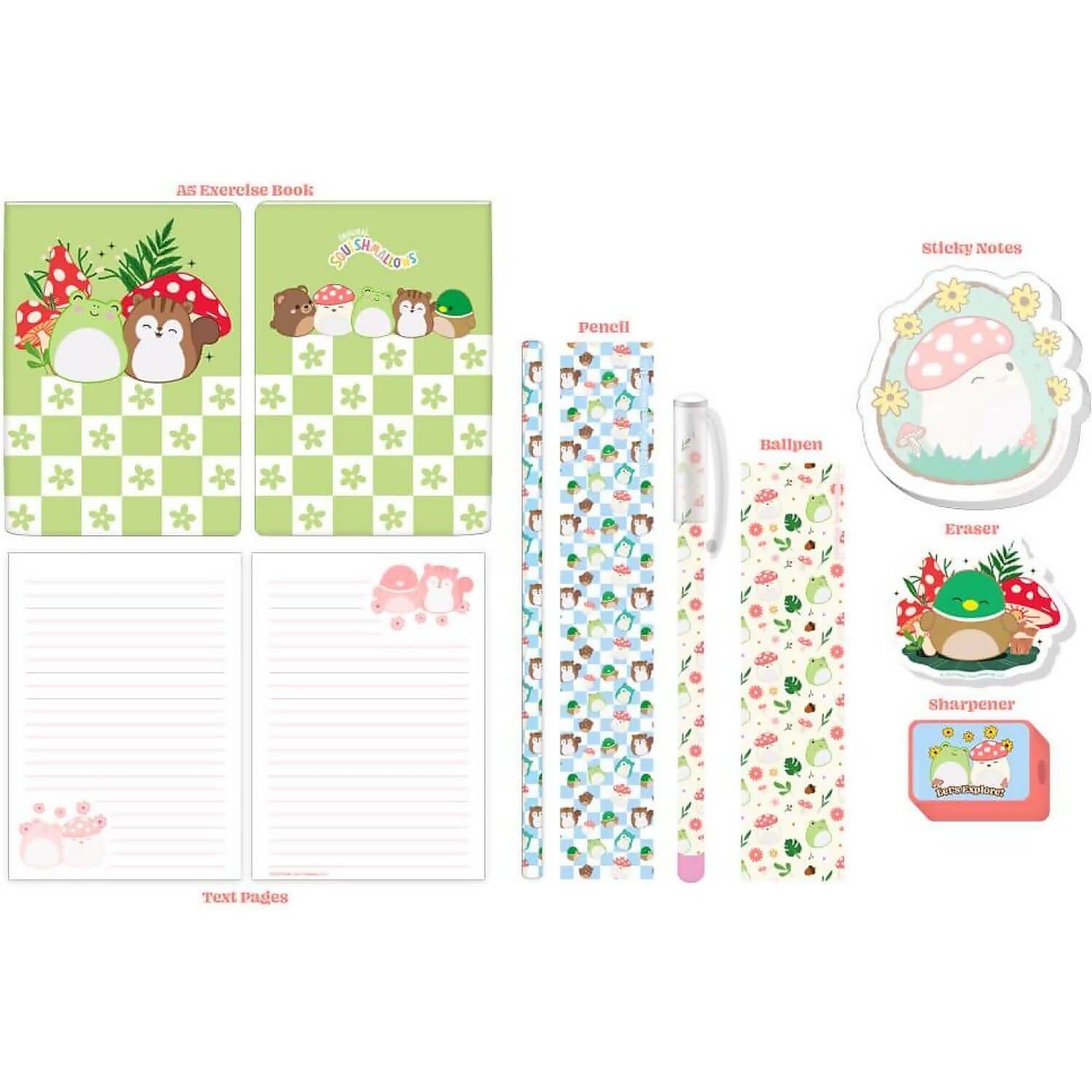 Presented in a clear wallet decorated with several popular Squishmallows characters and the caption 'Squish Squad'. Set includes an A5 notebook, pencil, pen, eraser, sharpener and sticky notes.