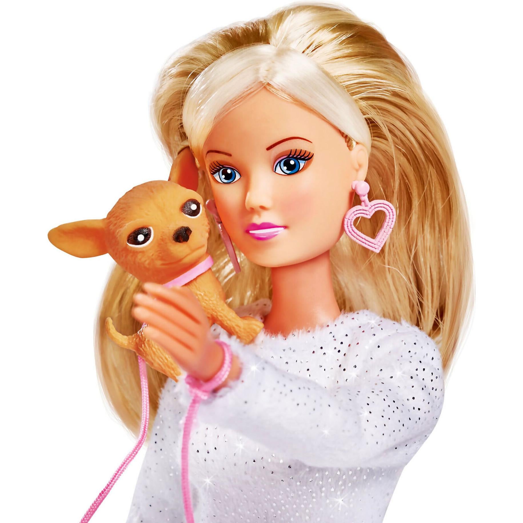Steffi Love - Chic Walk is a delightful product from the Steffi Love brand. The product features Steffi, a fashion-forward doll who loves to bring her beloved pets on her adventures. She is dressed in a fashionable dress with matching earrings, belt, and handbag. Her dress features a cute dog paw print, adding a touch of charm to her outfit.