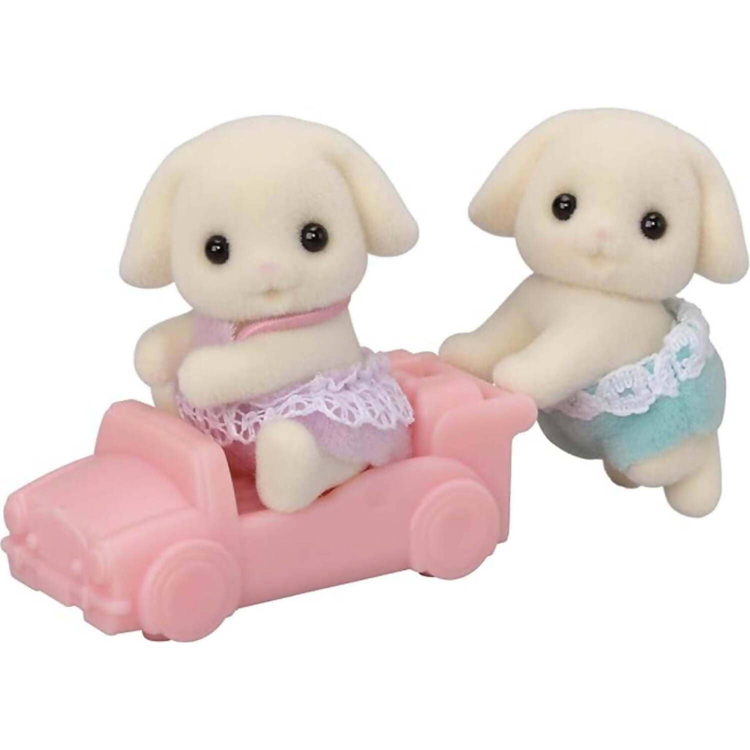 A figure set of Flora Rabbit twins with cute droopy ears and a push-cart. The sitting baby girl's name is Viola, and the crawling baby boy is Runo. The figures heads can be moved. Both of the Flora Rabbit twins (Sitting or Crawling) can ride the pushcart.