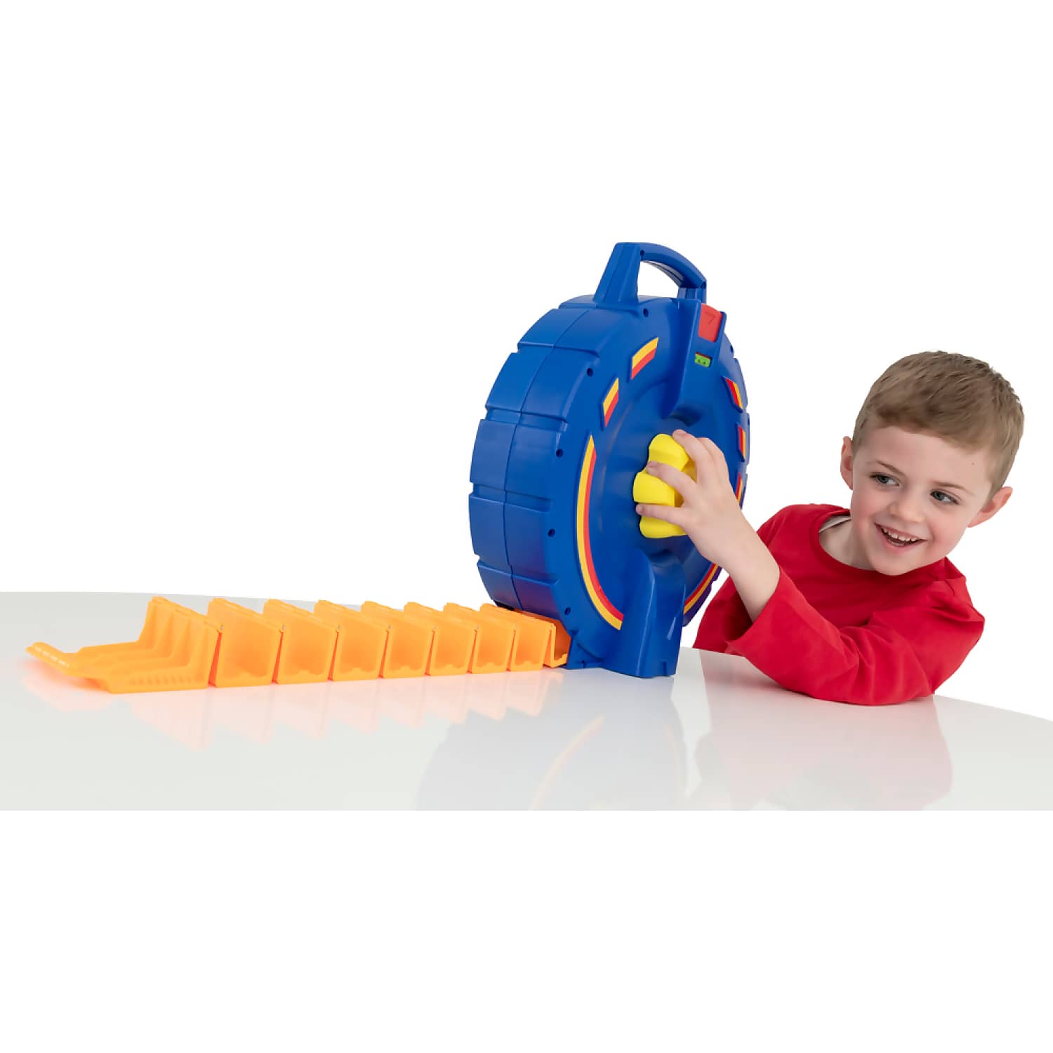 Turn the cog to reveal the unique car loading magazine, load up to 15 cars, pull down the door and press the launch button and shoot out all the cars in rapid-fire succession. The Load & Launch is also compatible with extruded track for broader play, as well as a carry handle for portable play.