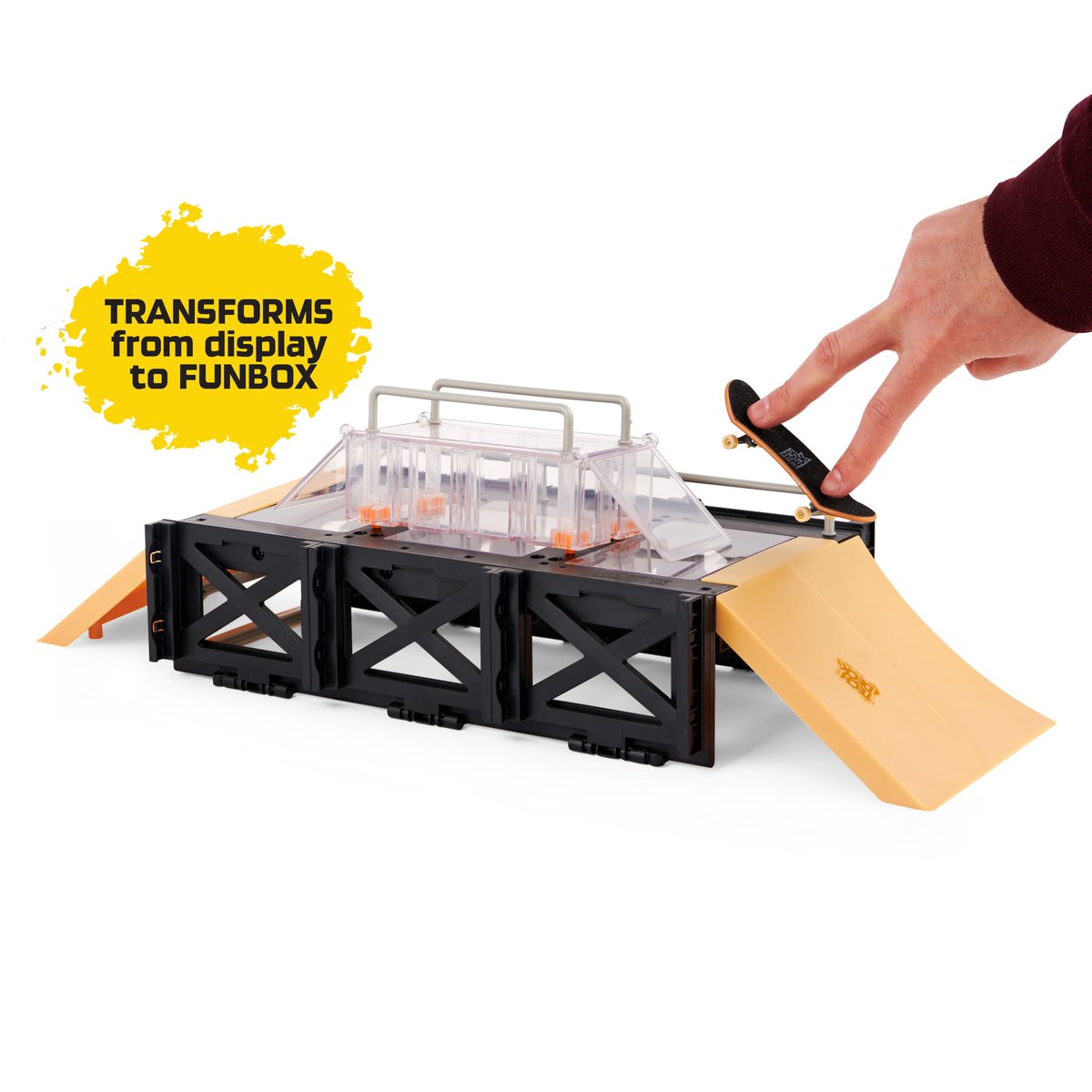 When you are ready to skate, the display case transforms into a funbox and ramp to learn and progress your tricks. Store up to 24 fingerboards (each sold separately) to take the action with you on the go. With the boards still intact, you can fold out the case to convert to a ramp with a funbox and rails to jump and grind! Skate the ramp with the included exclusive Element Skateboards fingerboard and add to your mini skateboard collection.