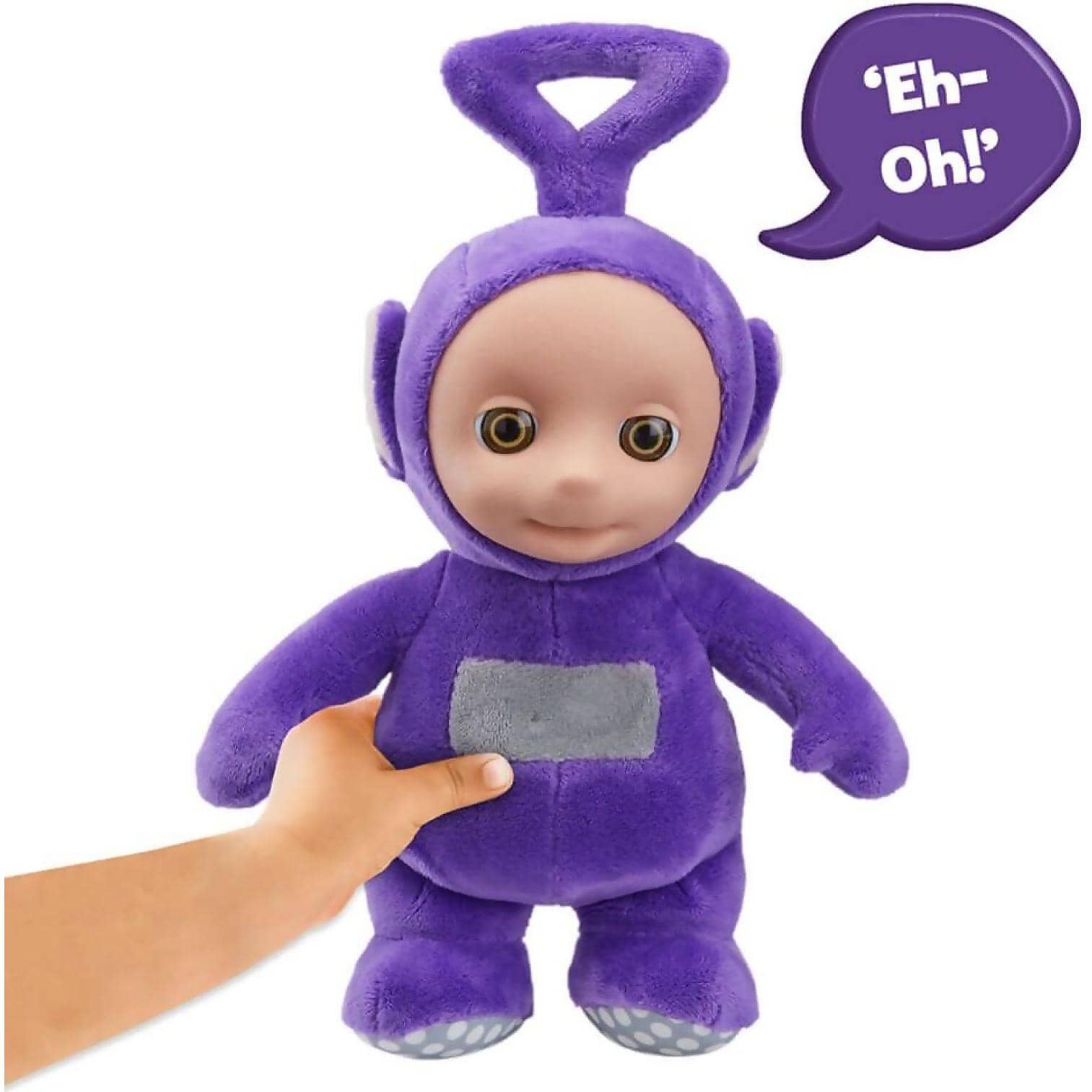 Cute and cuddly talking Tinky Winky. Made from super soft plush with original Teletubbies styling. Press Tinky Winky's tummy to hear him talk and say his signature phrases from the show.