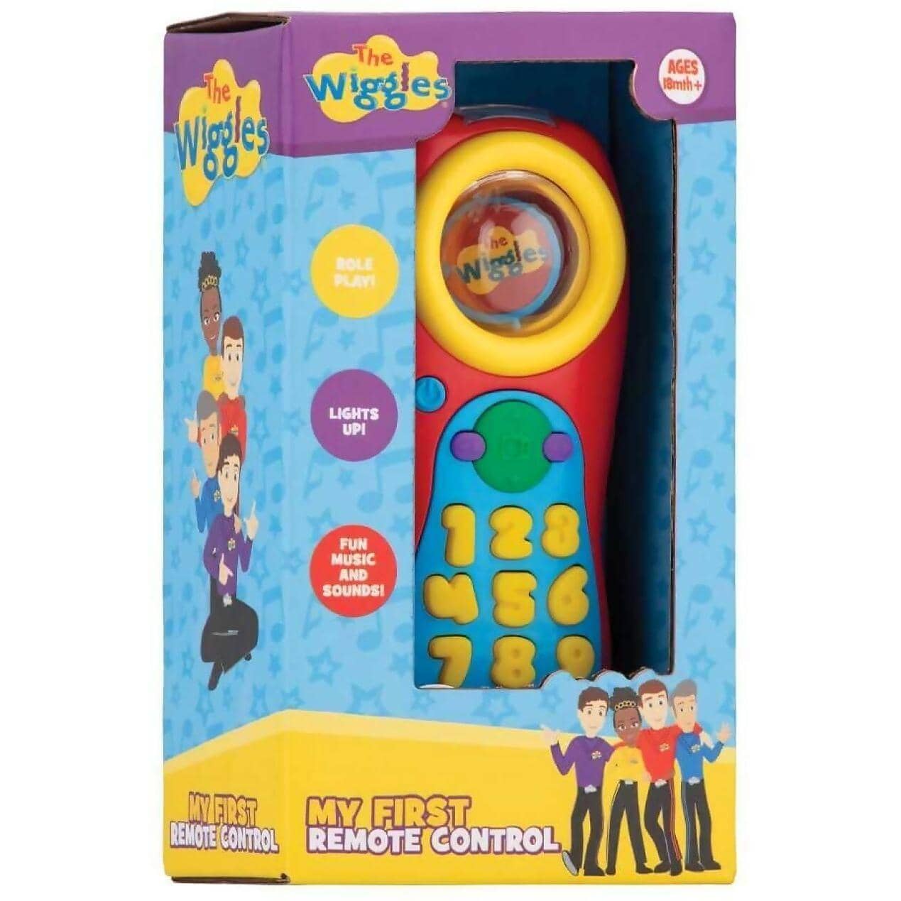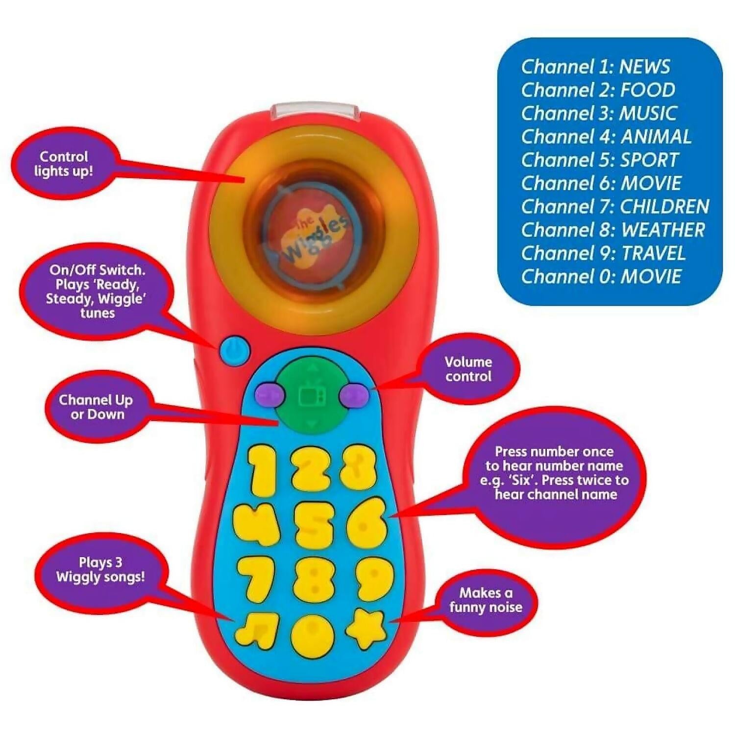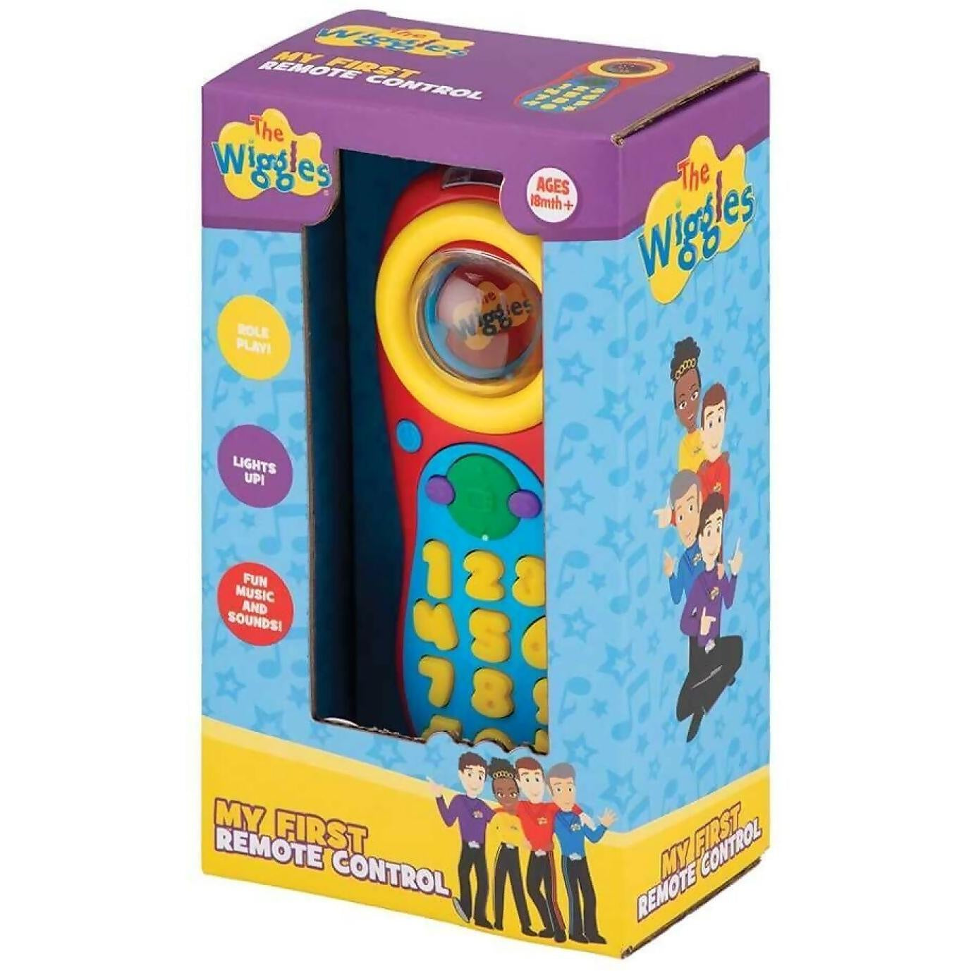 My First Remote Control is a perfect toy to help promote learning & listening skills, while the child can enjoy real life pretend play Features a realistic design with multiple channels and volume control button with fun sounds and three favourite Wiggles tunes – “Dippy Do Dinosaur Dance”, “Hot Potato” & “Rockabye Your Bear” for the child to dance along to and enjoy The button lights up, press the number button once to hear the channel number, press it twice to hear the channel type Spin the ball and watch the disc rotate inside