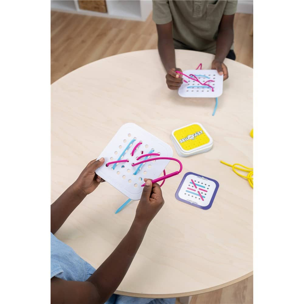 How fast can you sew? Each player gets a sewing board and three strings in three colors. Flip over one of the challenge cards and then... Ready, set, SEW!