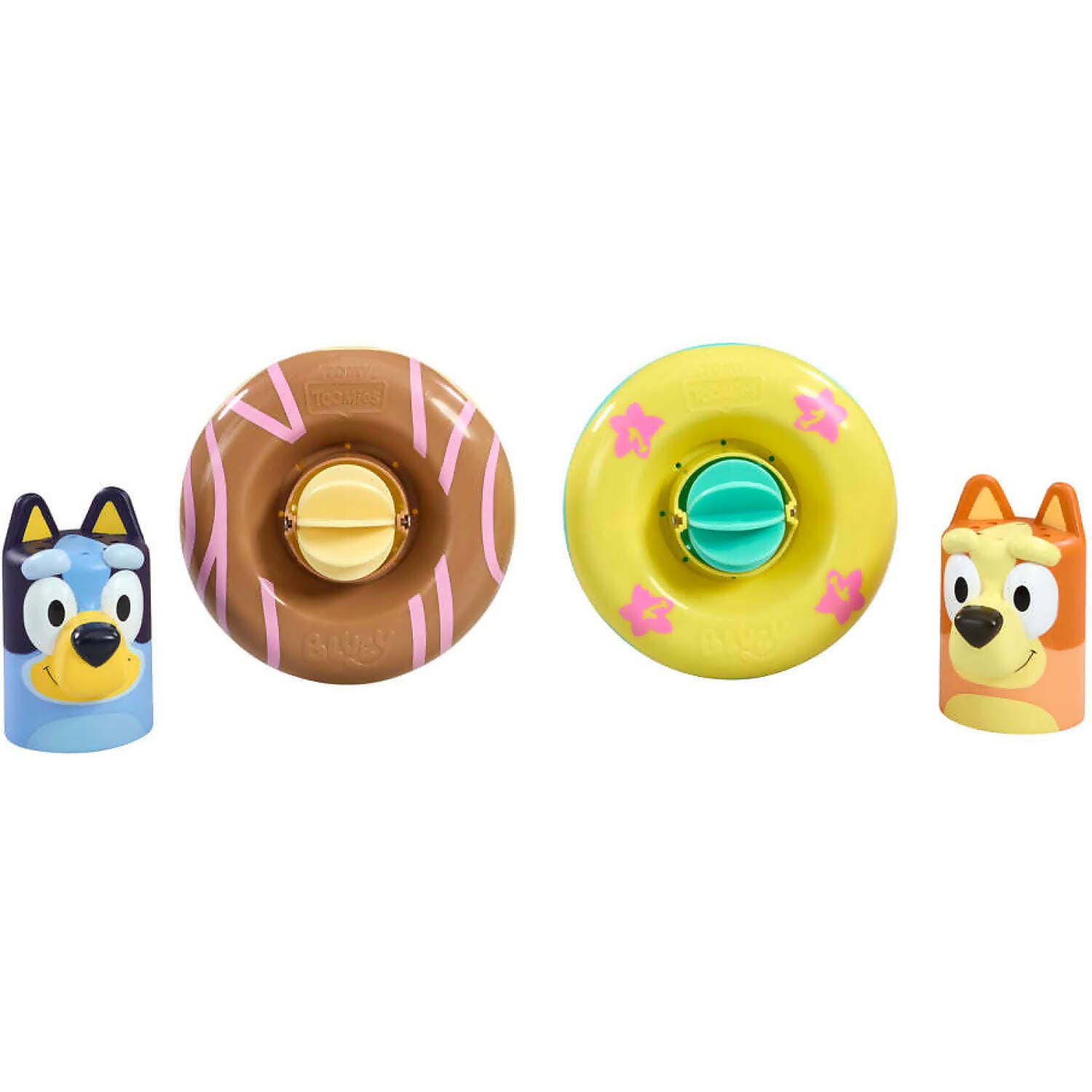 - Sprinkle & Pour: Bluey and Bingo drift along happily in their donut pool floats, but toddlers can pull them up and use them to pour water over the float to set the wheel spinning; lifting the floats provides even more sprinkling fun