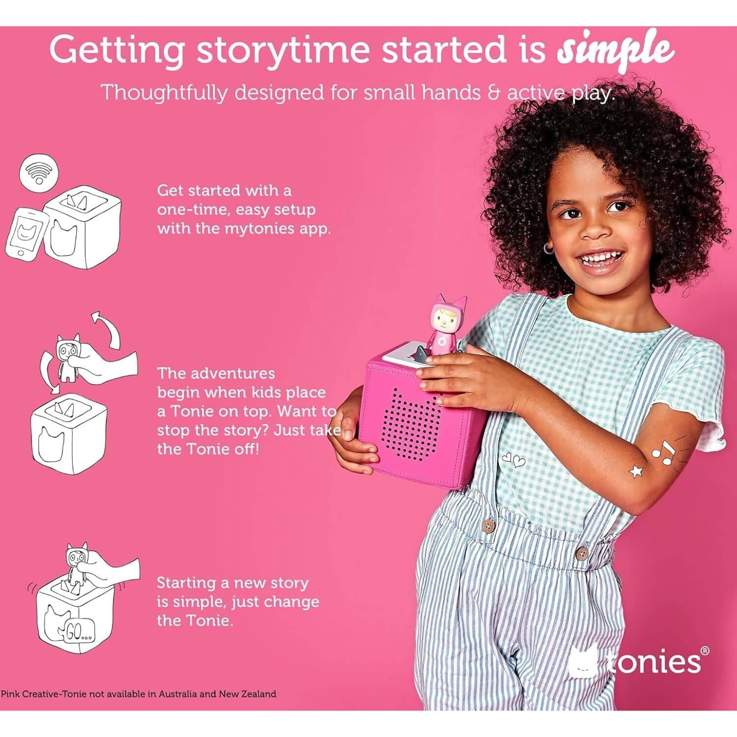 - The Toniebox combines audio and entertainment unlike any other way. When Tonies are placed on the Toniebox, magical worlds of music, adventures and fairy tales open up. After a simple setup, children can use the Toniebox on their own without any problems and turn their imagination into reality. Still want to know more? Scroll down to learn more about the tonies® universe!