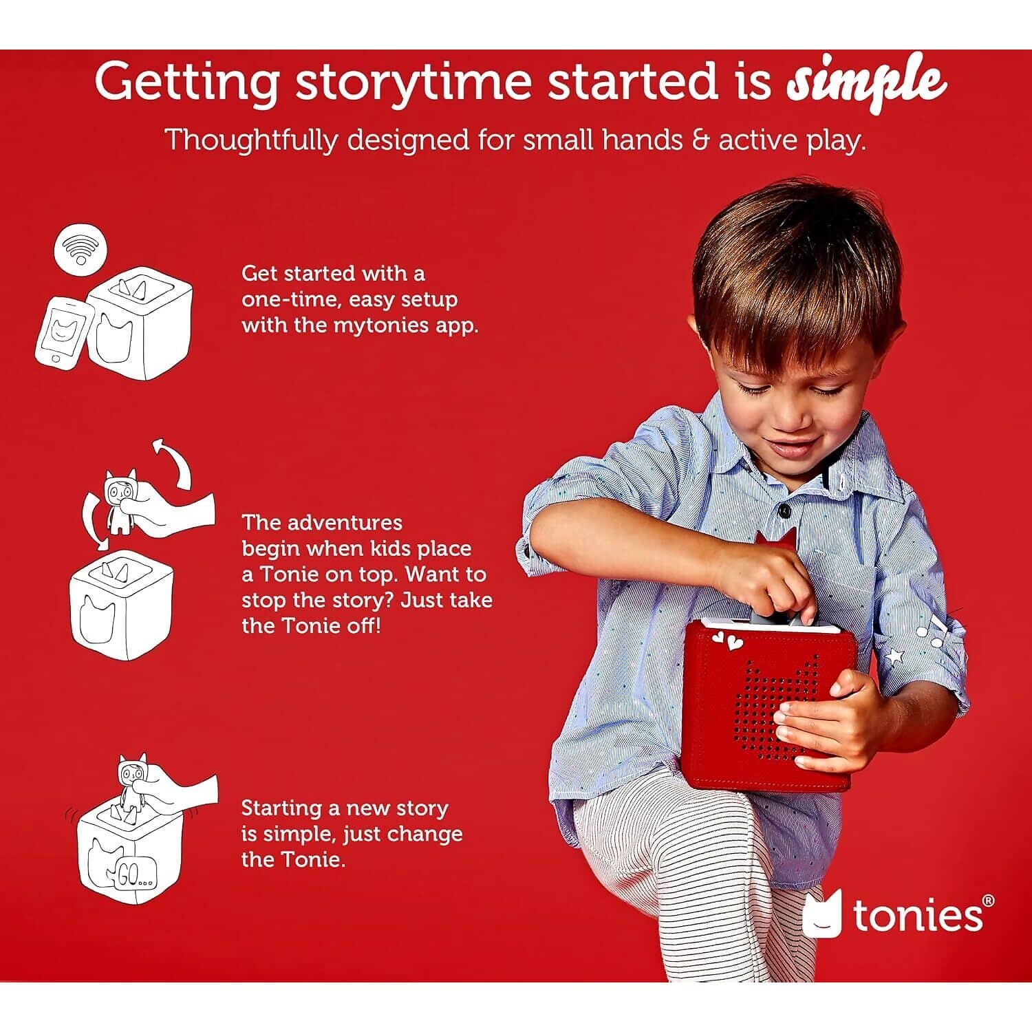 - The Toniebox combines audio and entertainment unlike any other way. When Tonies are placed on the Toniebox, magical worlds of music, adventures and fairy tales open up. After a simple setup, children can use the Toniebox on their own without any problems and turn their imagination into reality. Still want to know more? Scroll down to learn more about the tonies® universe!