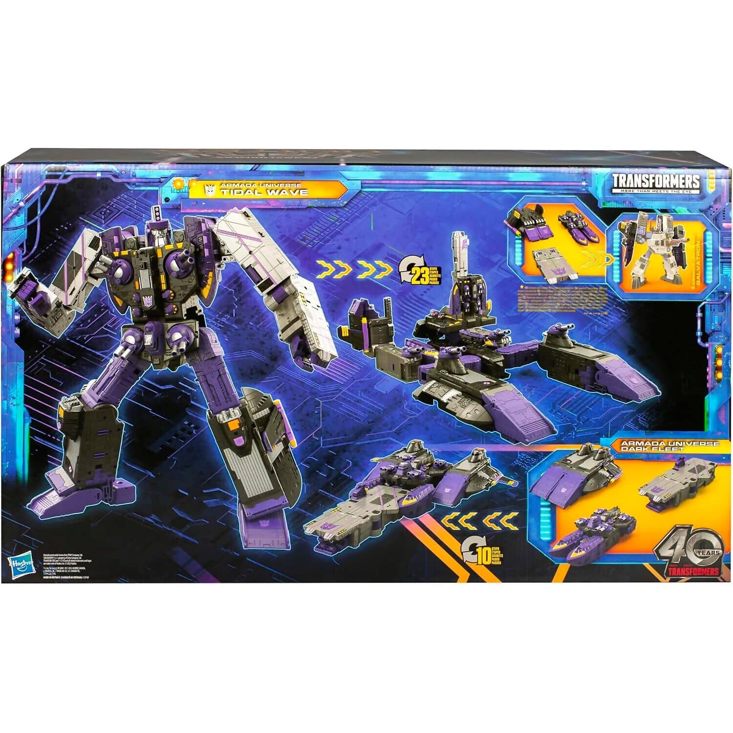 Transforming from robot to battle station in 23 steps, this figure offers dual-mode play and display versatility. It separates into three Armada Universe Dark Fleet vehicle toys, which combine into a battleship configuration for expanded play. When paired with Armada Universe Megatron or Galvatron (sold separately), it unlocks an enhanced battle mode, elevating the figure’s role in any collection.