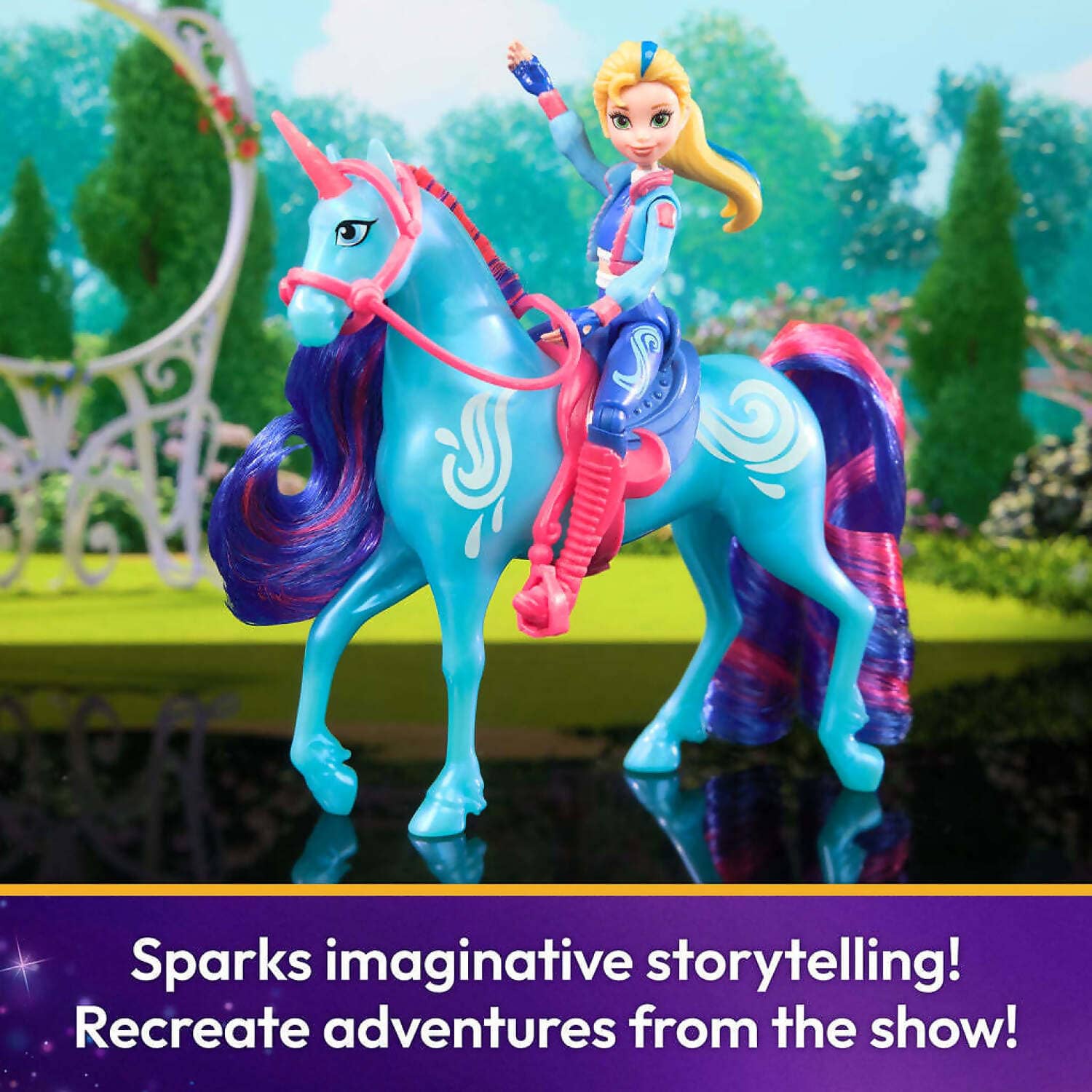 UNICORN TOY & ACCESSORIES: River’s details include Water Magic markings and blue and pink mane and tail – keep them shiny and smooth with the brush! The saddle and bridle doll accessories are removable, too!