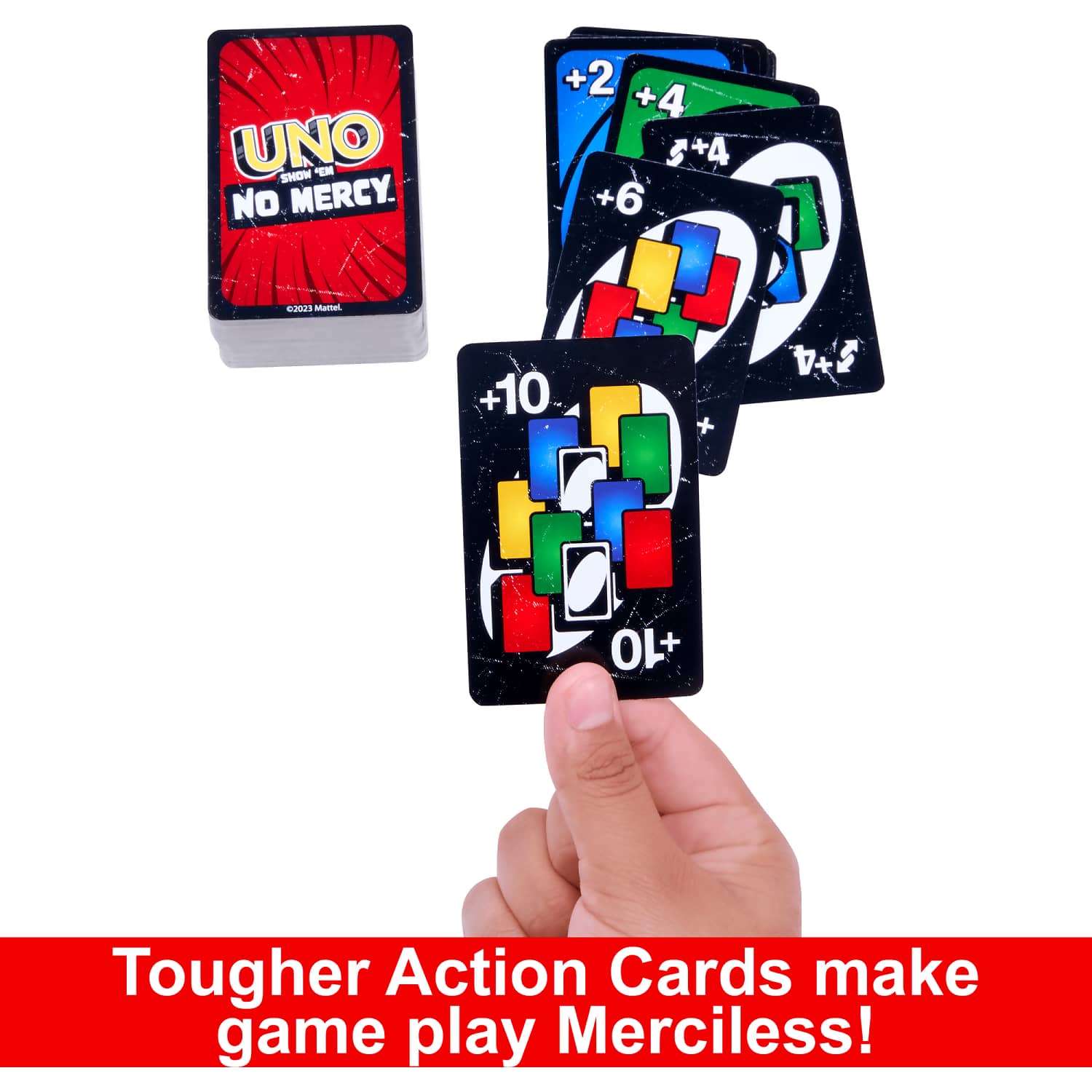 - UNO Show 'em No Mercy game adds 56 more cards, special rules and super-tough action cards for the most brutal edition of UNO ever!