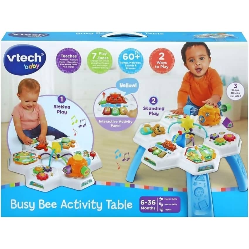 Buzz into learning fun with the VTech Baby Busy Bee Activity Table – Blue, a vibrant 2-in-1 play centre designed to grow with your child. Whether seated or standing, little ones can explore six interactive zones including light-up piano keys, a peek-a-boo fox, a mini storybook and a twisting bear. Each zone introduces early learning concepts such as colours, animals, numbers and songs while supporting sensory development and motor skills.