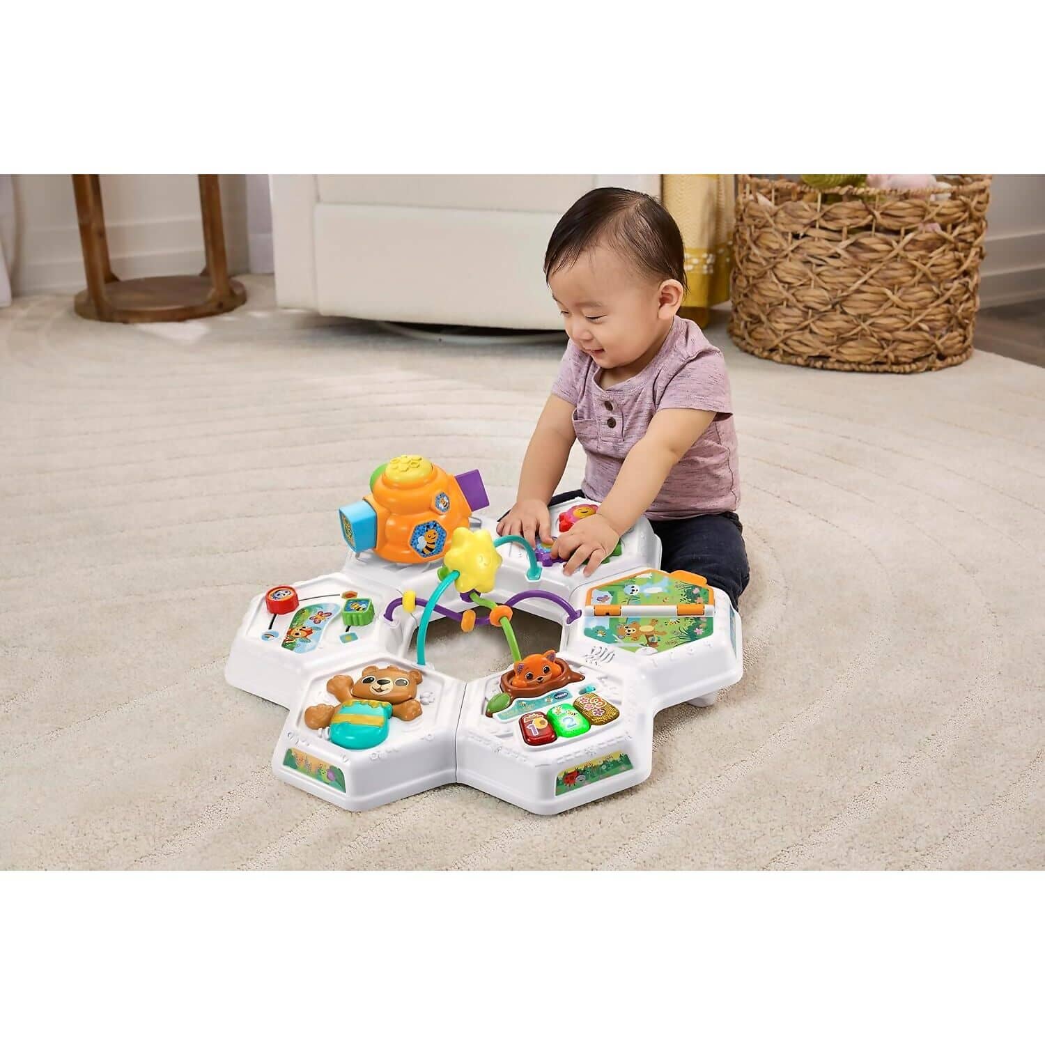 Children can turn gears, slide animals, and sort shapes into the beehive for engaging cause-and-effect play. The table encourages auditory awareness and language development through cheerful phrases, 3 sing-along songs and 15 melodies. With removable legs for floor play and easy storage, this activity table adapts to your baby’s developmental stages.