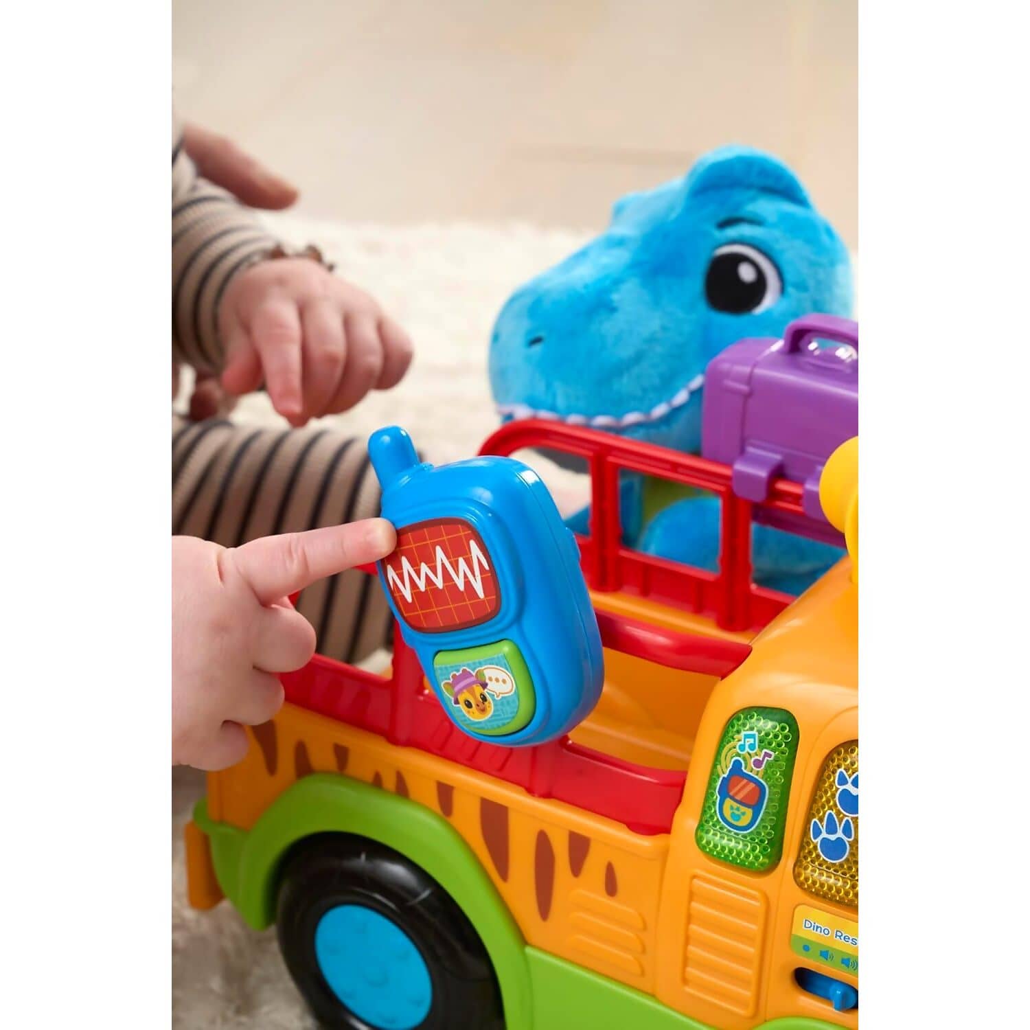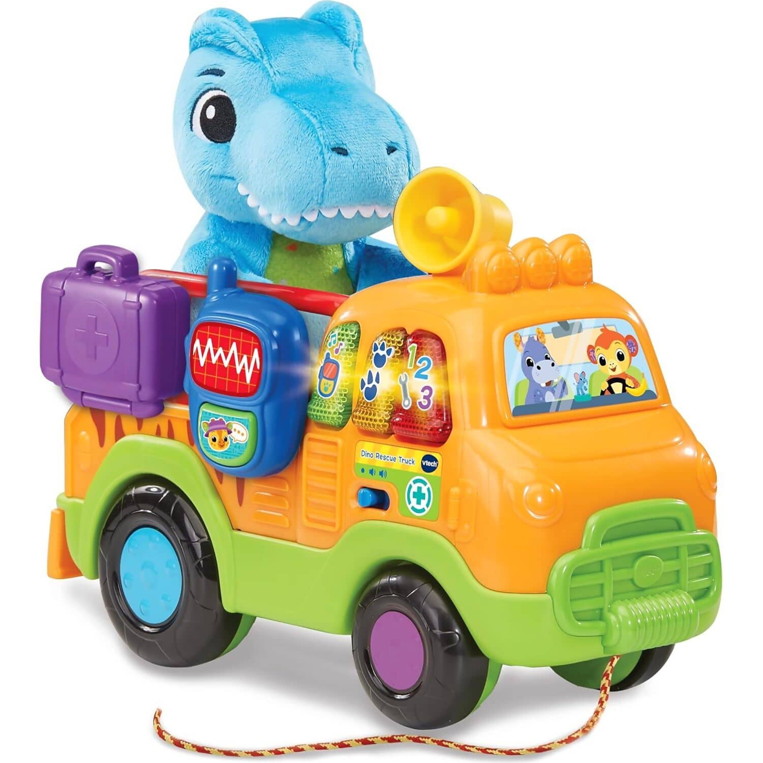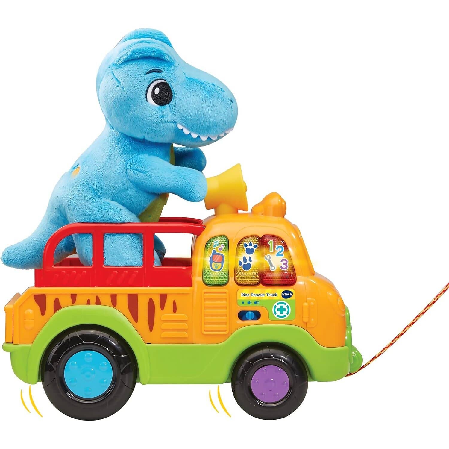 Embark on a prehistoric rescue mission with the VTech Baby Dino Rescue Truck, a pull-along toy packed with interactive features and imaginative play. Toddlers can push or pull the truck using the cord, triggering exciting sounds and phrases that encourage movement and exploration. The soft blue plush T-Rex is ready to be rescued and cared for, adding a nurturing role-play element to the adventure.