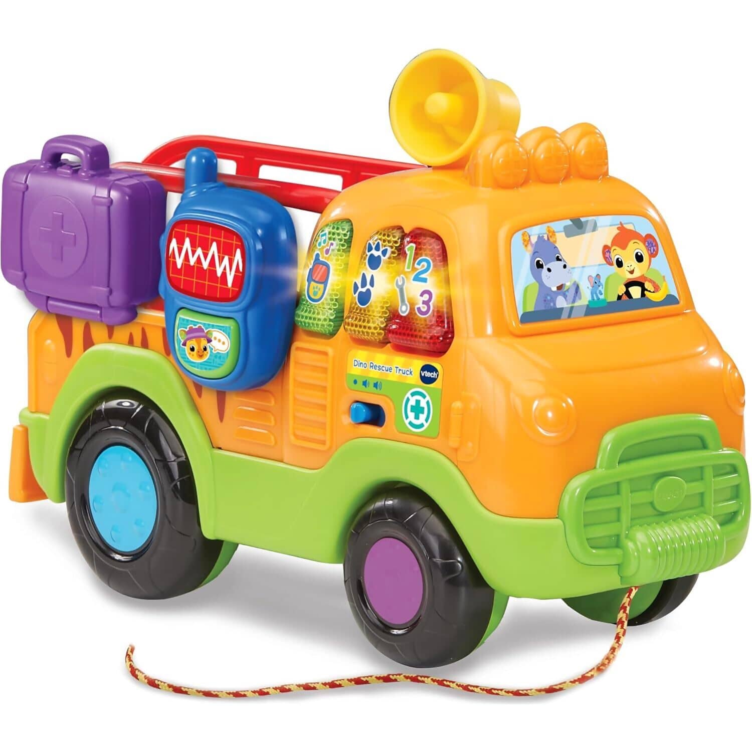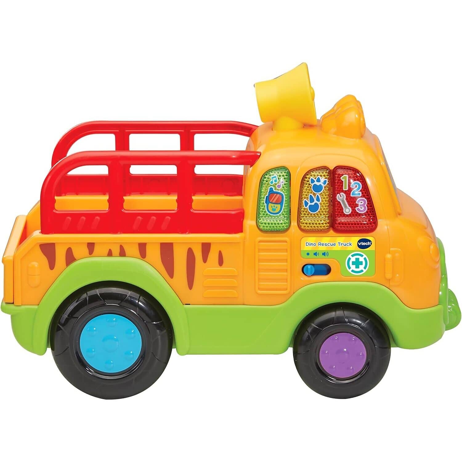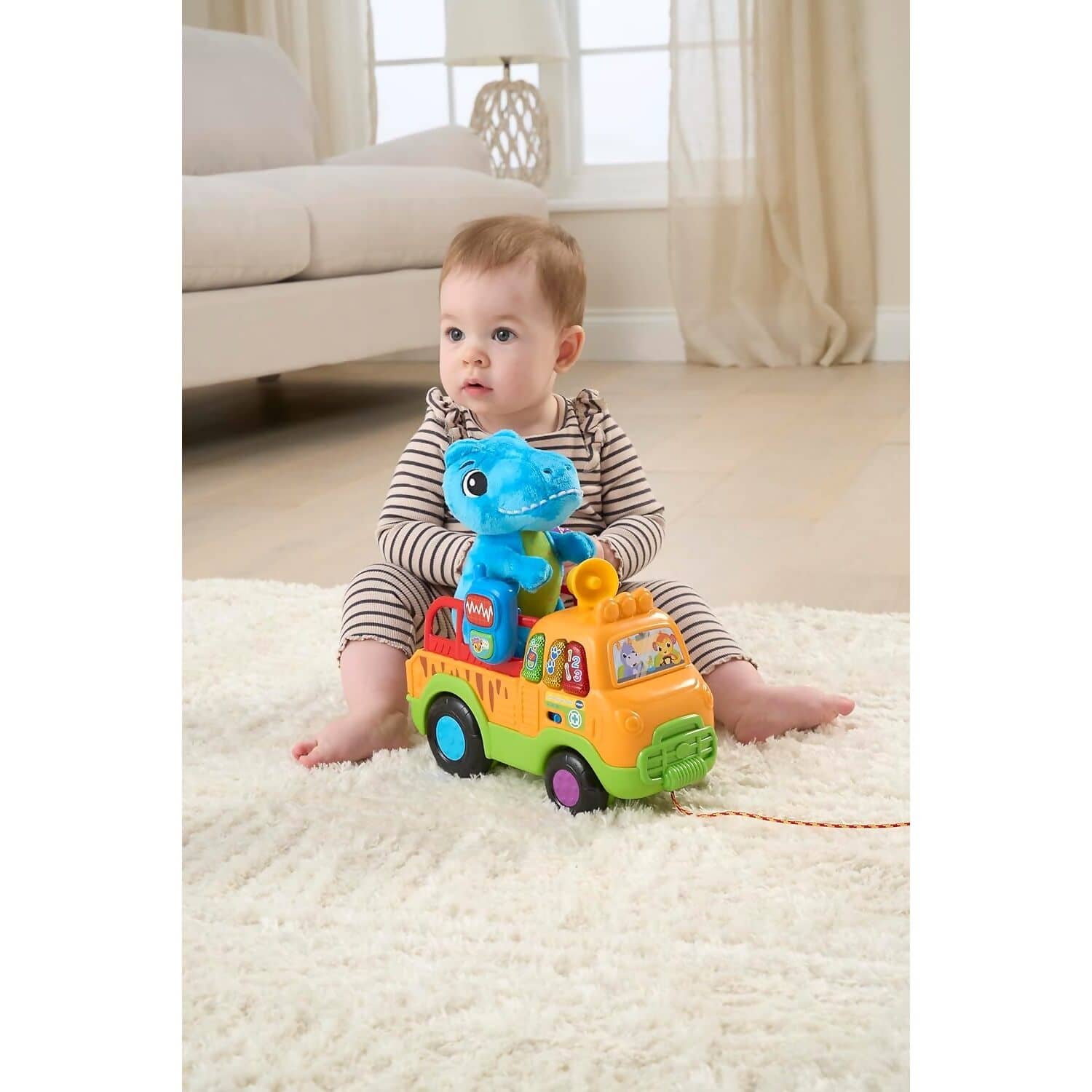Embark on a prehistoric rescue mission with the VTech Baby Dino Rescue Truck, a pull-along toy packed with interactive features and imaginative play. Toddlers can push or pull the truck using the cord, triggering exciting sounds and phrases that encourage movement and exploration. The soft blue plush T-Rex is ready to be rescued and cared for, adding a nurturing role-play element to the adventure.