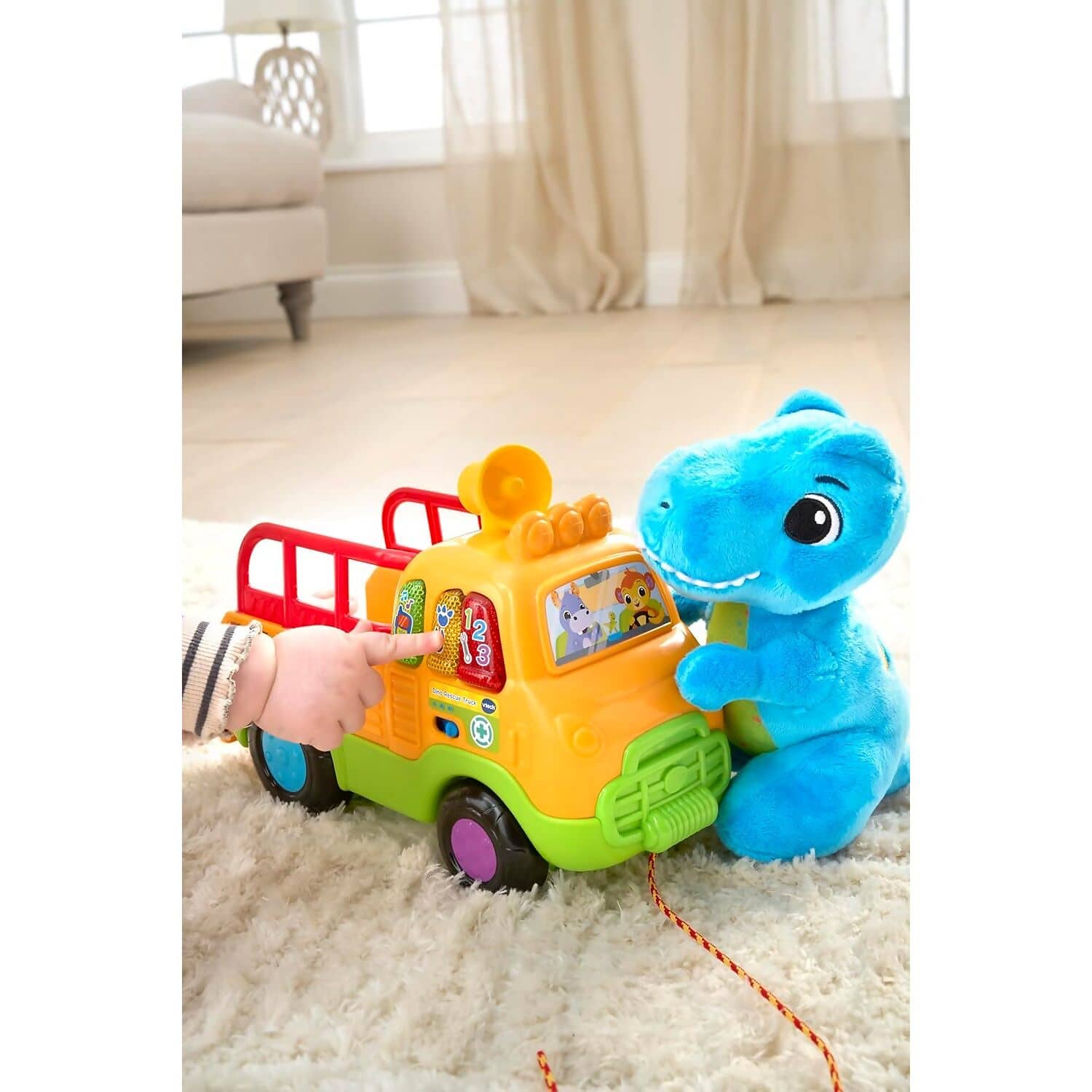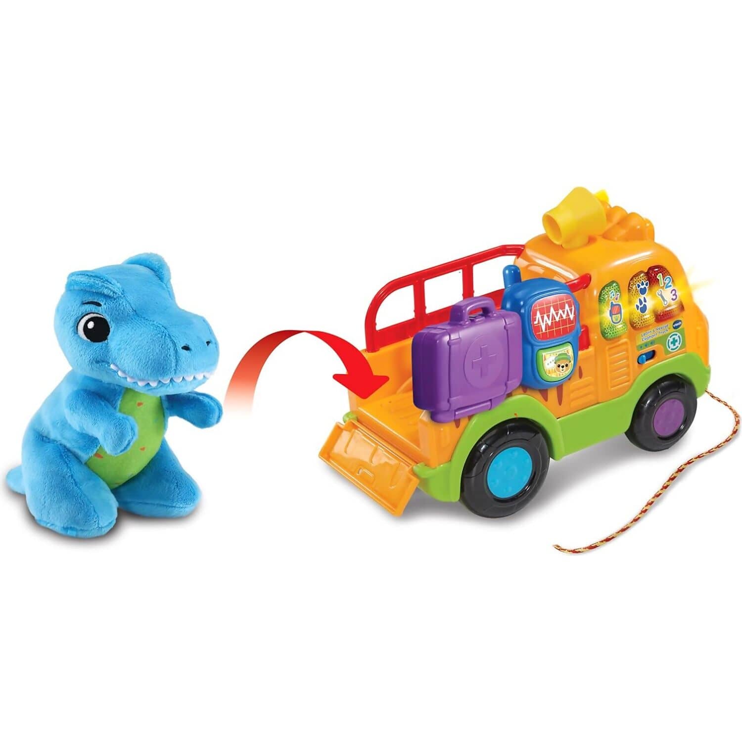 - Pull-along truck with cord and soft plush T-Rex