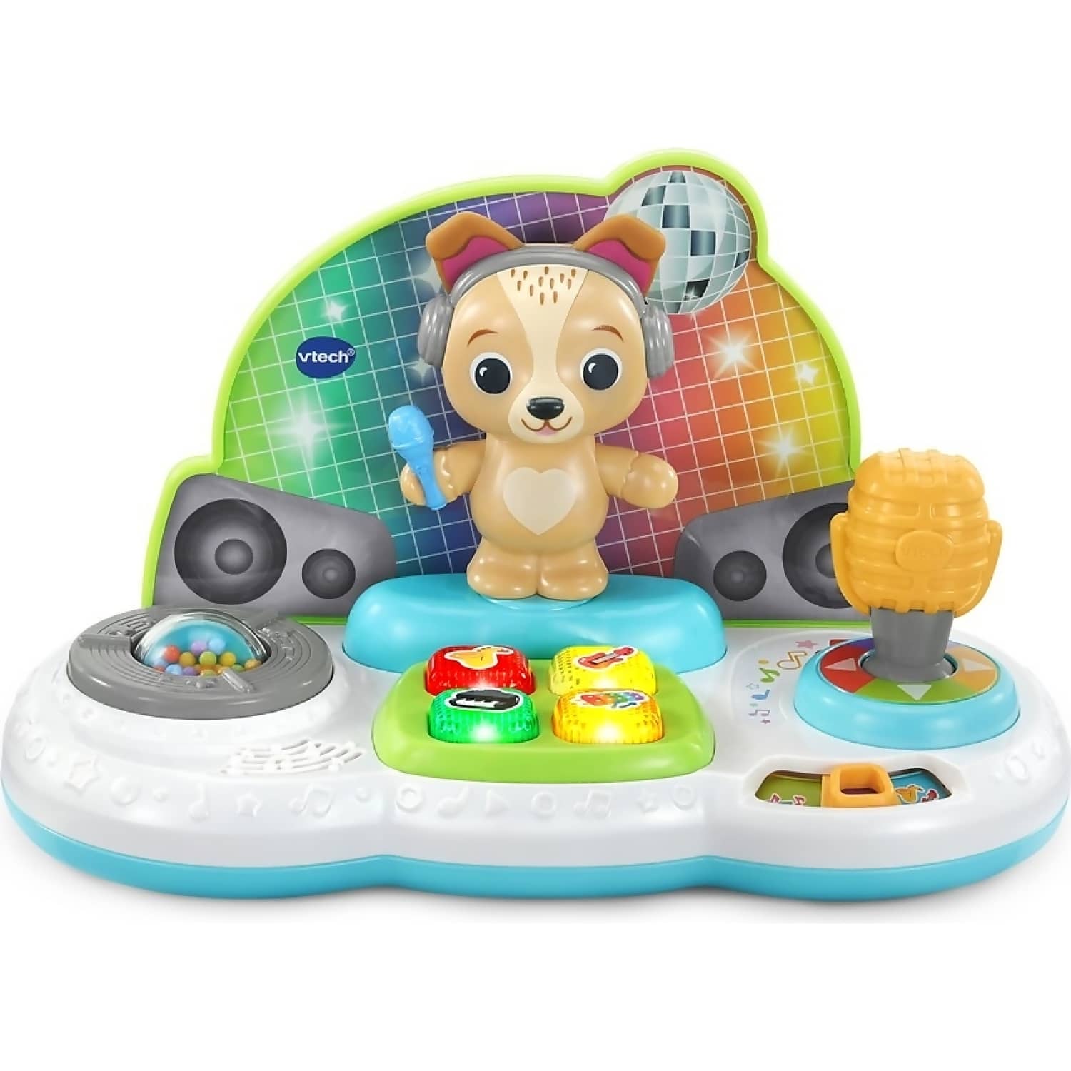 Get the party started with the interactive DJ Jams Puppy from VTech, designed to inspire musical exploration and movement. Little DJs can grab the microphone and wiggle it to make Puppy dance on stage, adding excitement to every performance. With music, learn, and play modes, children can mix over 60 songs, melodies, sounds, and phrases to create their own DJ experience.