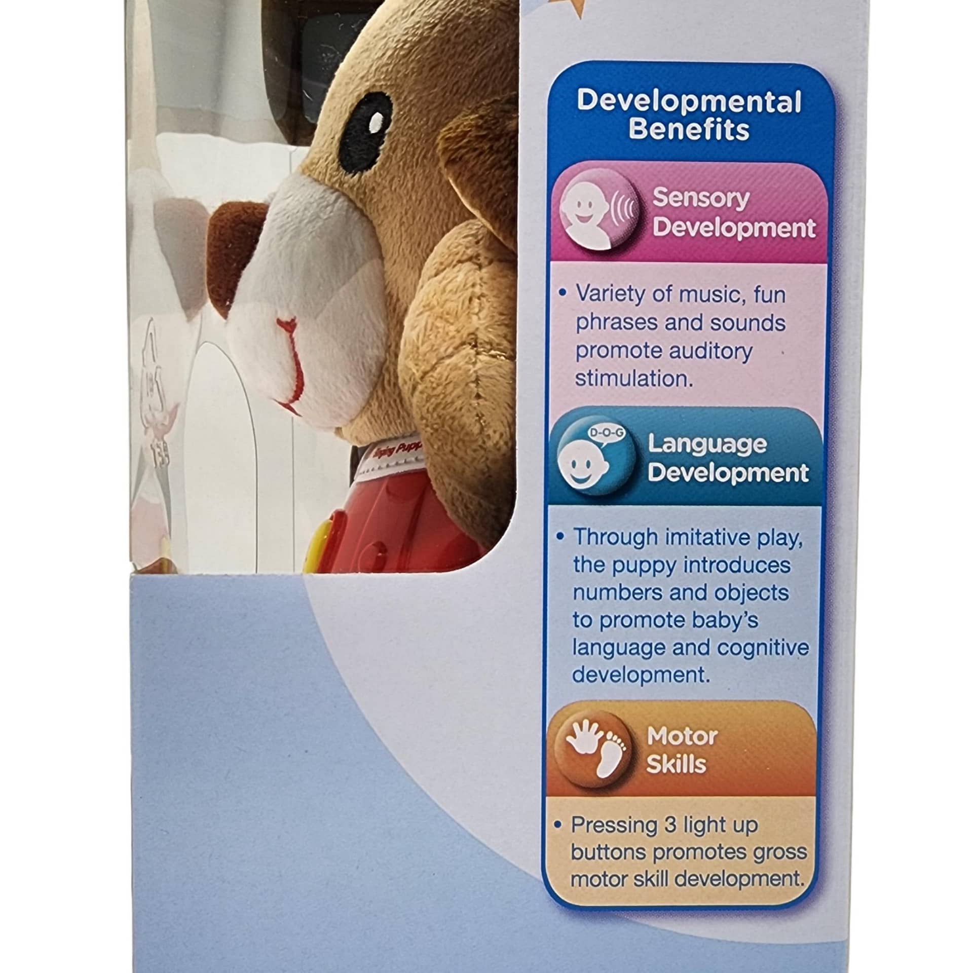 - Press the 3 light-up buttons to be introduced to numbers, feelings, and puppy objects