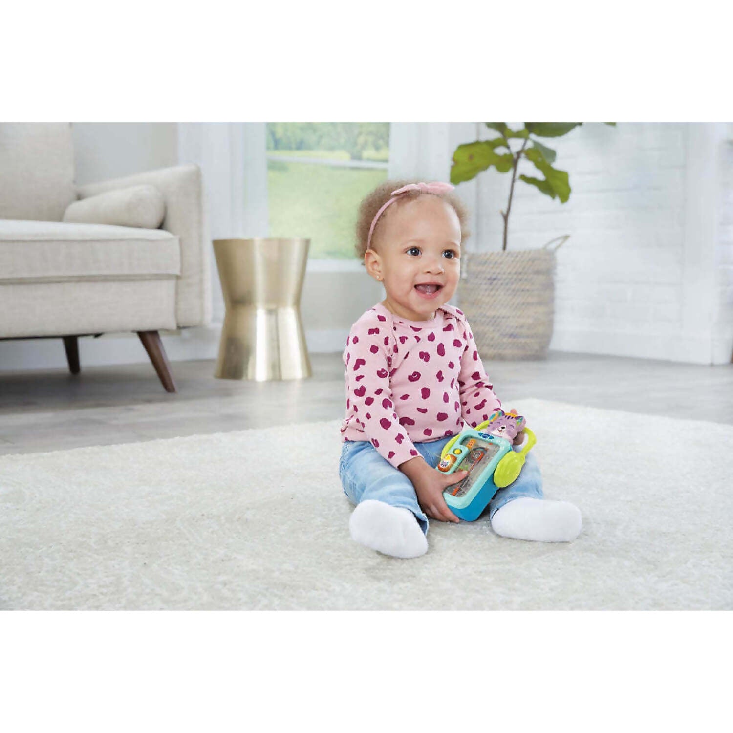 - On-the-go, retro music player style toy with carry handle earphones is a great way to introduce your little one to music