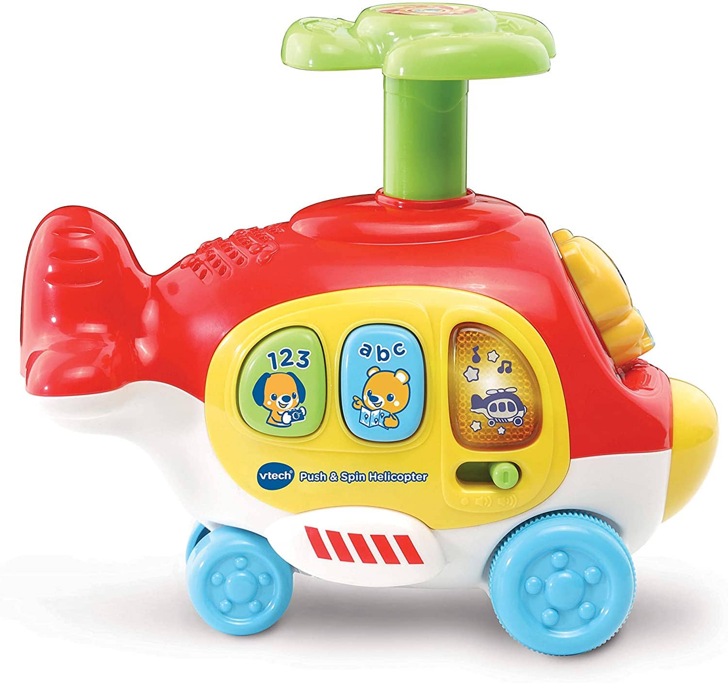Fasten your seat belt. We're ready for an adventure! Take off into learning with the Push and Spin Helicopter by VTech! Press the top rotor blade to see the helicopter roll forward, which will support your baby in discovering cause and effect relationships. The 2 animal buttons are great for exploring as they trigger lights, catchy music and fun responses. The cool phrases, sounds and melodies encourage discovery and exploration and introduce your baby to animals, numbers, colours and letters. Includes 3 uplifting sing-along songs and 10 fun melodies which encourages language development.