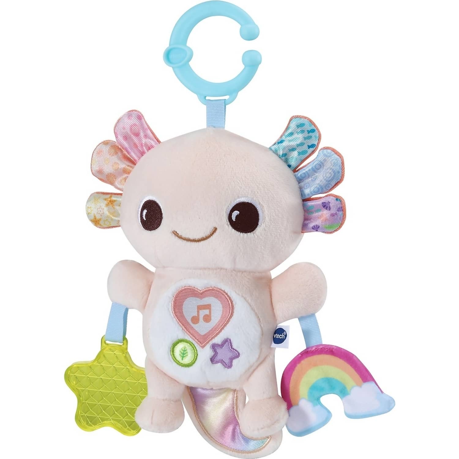 Children can press the three soft buttons on the axolotl’s tummy to hear playful phrases, nature sounds, and catchy tunes. A dangling transparent star and crinkly rainbow add layers of sensory fun, while the colourful gradient tail enhances visual awareness. With a convenient C-ring attachment, it’s ideal for on-the-go play, easily fastening to baby carriers or pushchairs.