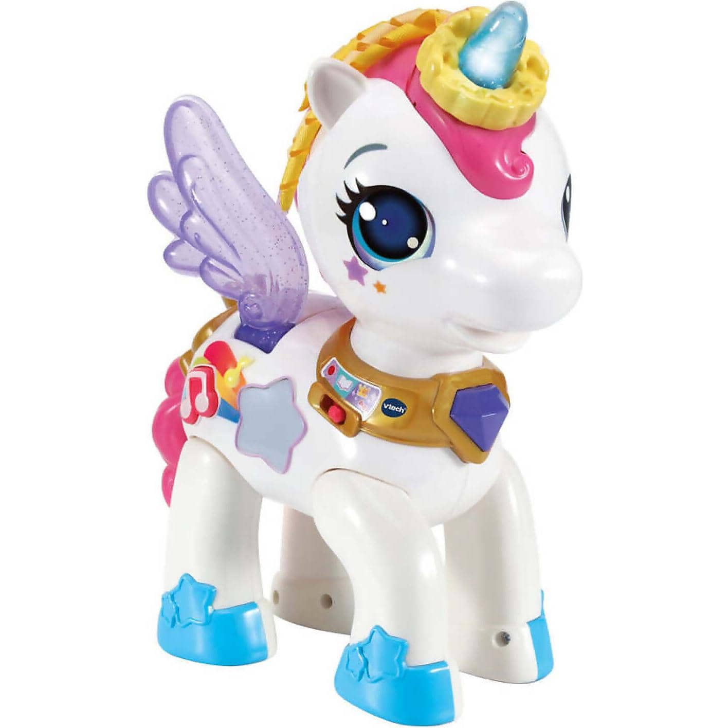 As she plays dazzling sounds, place an accessory on her horn to see her star change colour to match. Add music to the colourful dress-up party by pressing the music button. The unicorn will play five- or ten-minute songs and her horn and star will flash to the beat. Flap her wings to help her fly and together you’ll sparkle wherever you go!