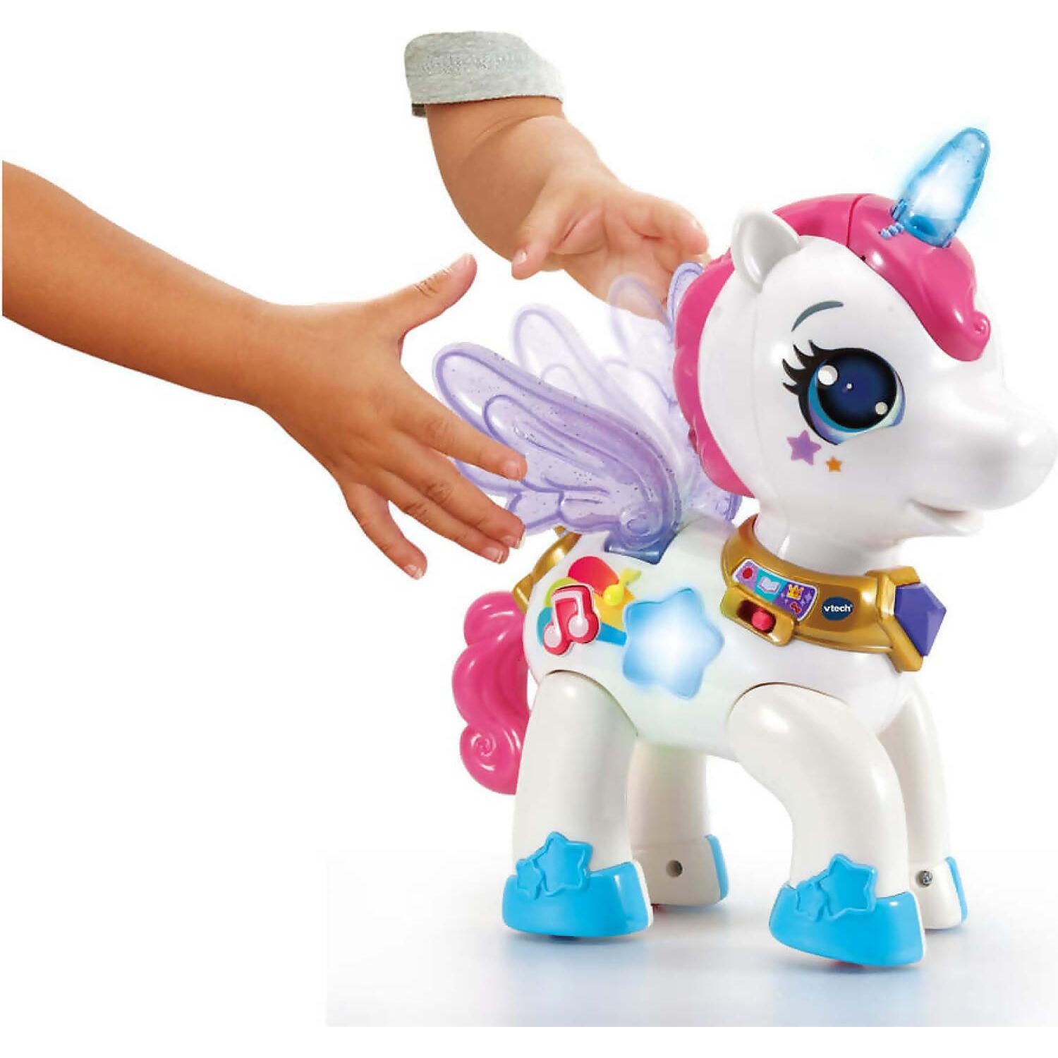 Hear the unicorn describe each accessory and explore colours, counting, feelings and more. Coordinate the colour of the unicorn’s star by pressing the gem on her necklace.