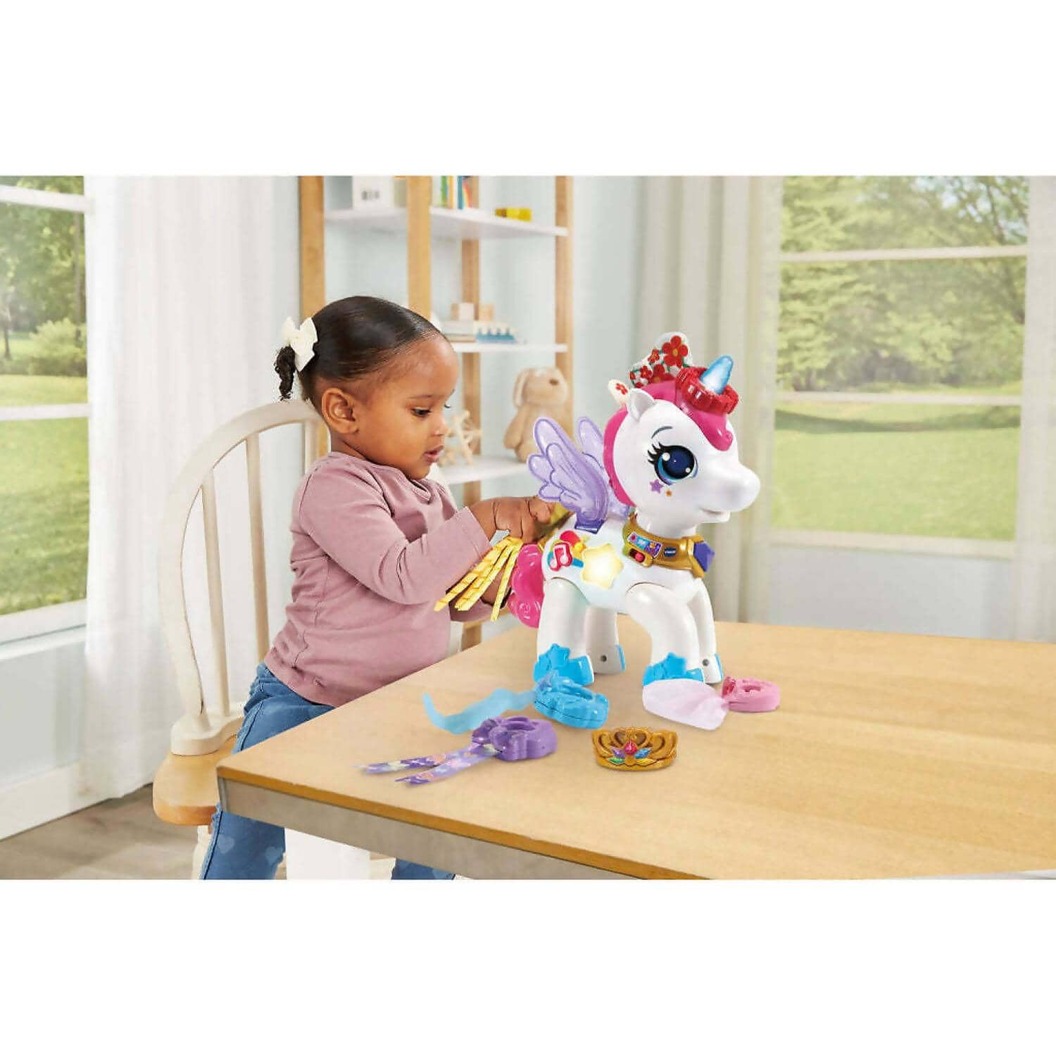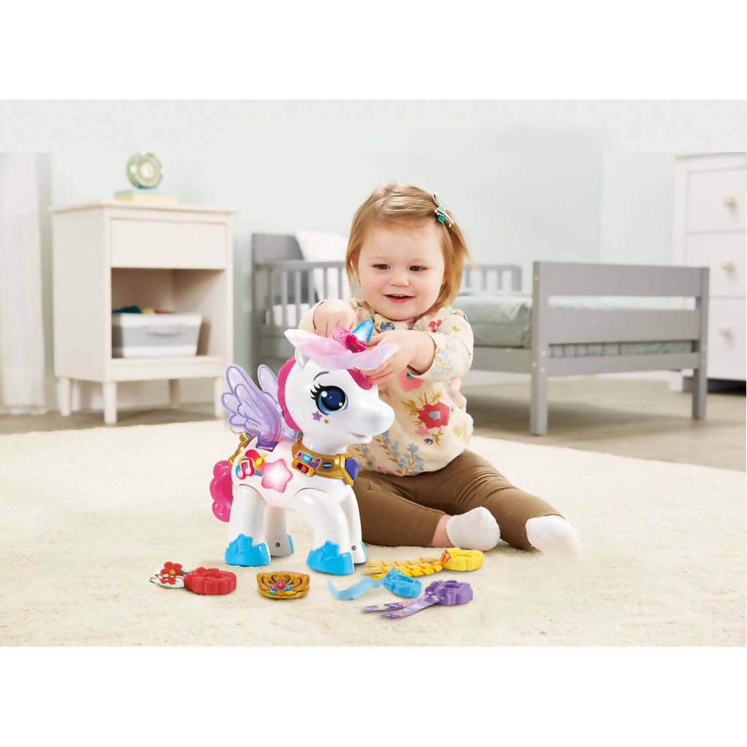 It’s a magical day when you play with the Style & Sparkle Unicorn by VTech. Let’s accessorise! Choose from six glamorous accessories to decorate the unicorn’s horn and tail. The ribbon is purple!