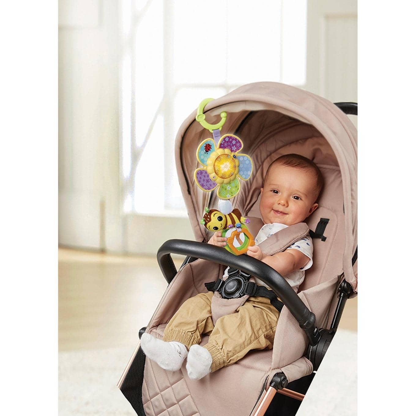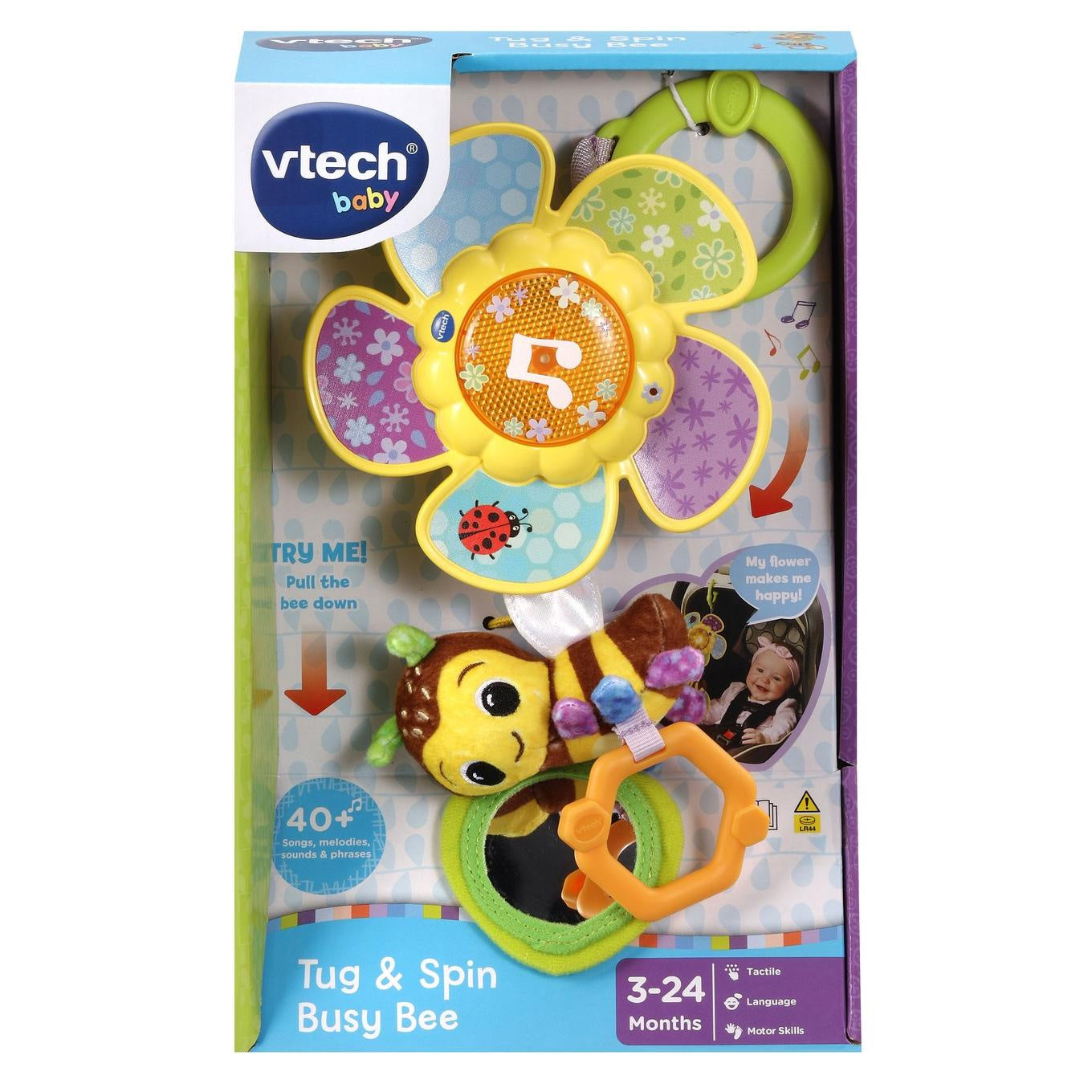 Introducing the Tug & Spin Busy Bee by VTech! This adorable bumble bee is perfect for on-the-go play and entertainment. The bee’s textured fabric provides tactile stimulation and encourages interaction. Pull down the honeycomb ring or leaf mirror to watch the flower spin and trigger fun phrases and sing-along songs that encourage language development. The flower also lights up with the sounds. The C ring easily attaches to pushchairs and car seats, making it easy to take your bumble bee with you wherever you go. The toy includes 4 catchy sing-along songs and 15 melodies that encourage auditory and language development.
