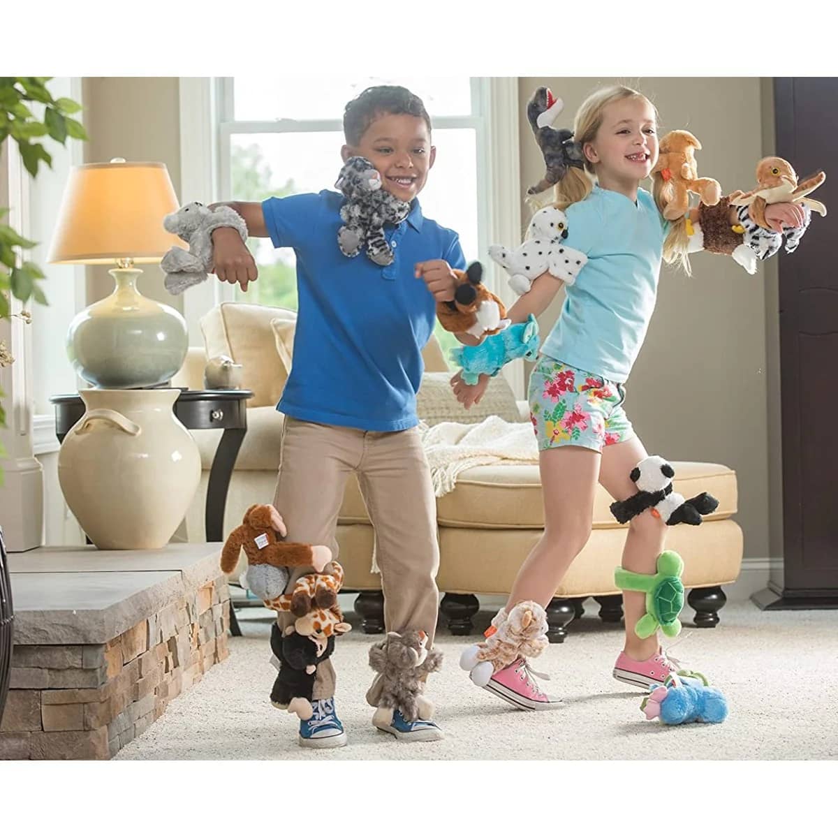 Just spread their arms wide, give the chest a squeeze and Huggers instantly wrap their arms around you. The triple protected snap bands provide a safe and friendly grip.