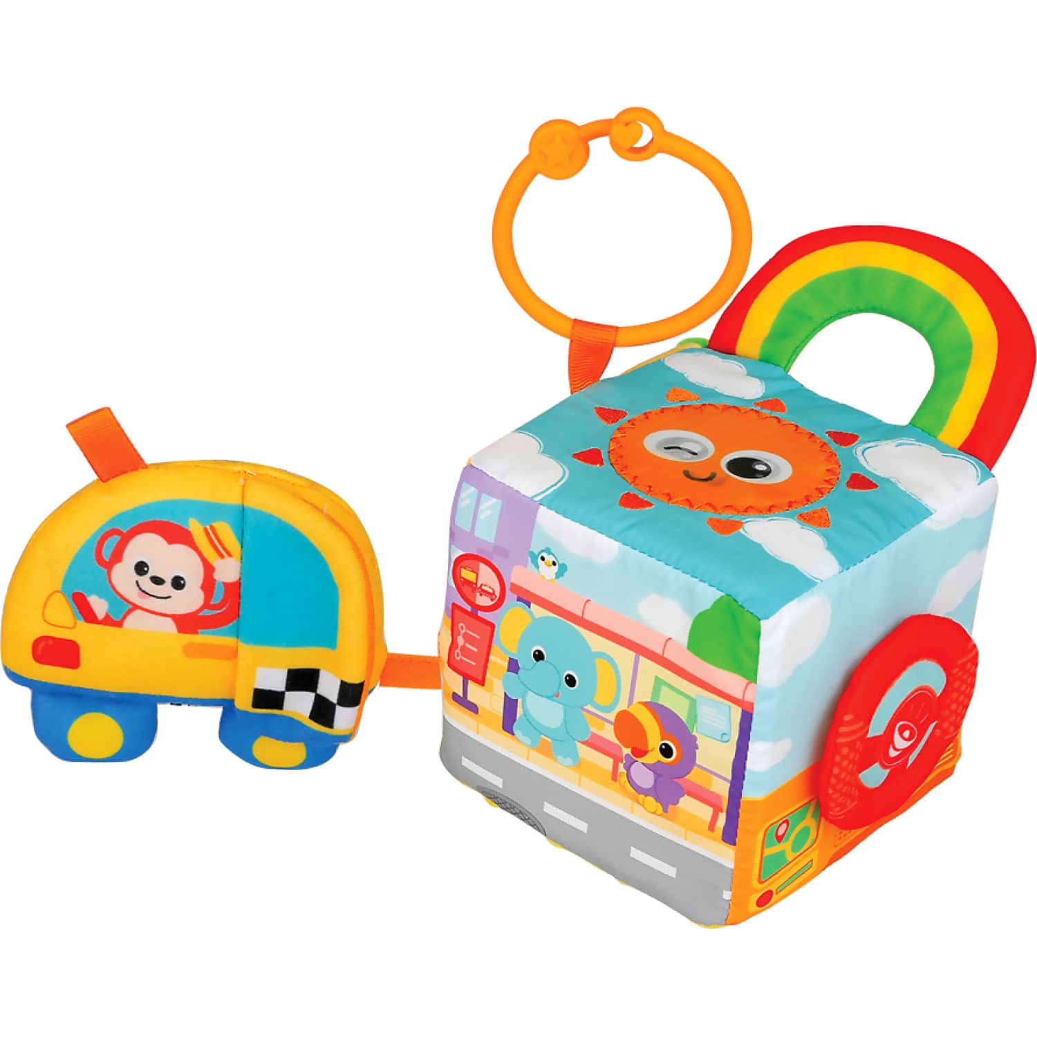 Winfun - Little Pals On The Move Activity Cube is a multi-activity cube for little hands to explore. It features a smiling sun face, squeaky and crinkle taxi, baby-safe mirror, colorful rainbow handle and steering wheel. Different textured fabrics, bold contrasting colors and patterns capture baby’s attention and focus.